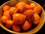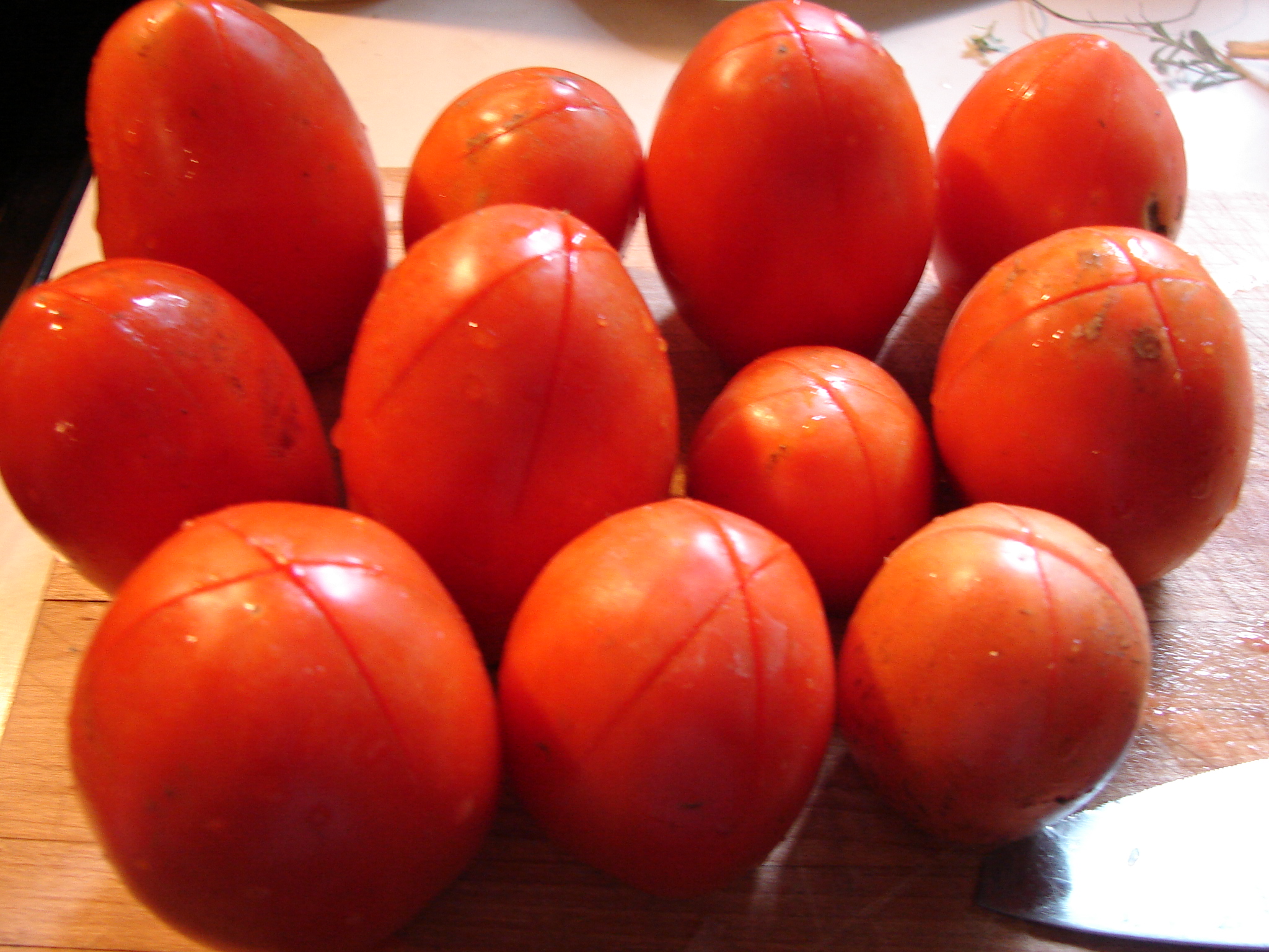 If you’re starting with fresh tomatoes (you can really use any variety), cut a small slice off their stem end, and make a small X in the other end.