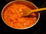 3. Let them simmer on medium low heat for a long time. FIrst they’ll get very juicy, then they’ll dry out, then they’ll become more and more of a paste and less and less of a sauce. And at some point, they’ll separate from the oil, which will be a beautiful reddish saffron color. That’s how you know they’re done. It can take up to an hour. You don’t have to stir them constantly, but it’s a good idea from time to time, because you don’t want them sticking and burning. If you have to add a drop of water now and again, toward the end, that’s fine.
