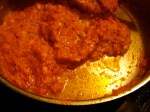 2. …tomatoes. (If you leave the paprkika in hot oil too long it will burn and get bitter). Let the tomatoes come almost to a boil, and then reduce heat and simmer.