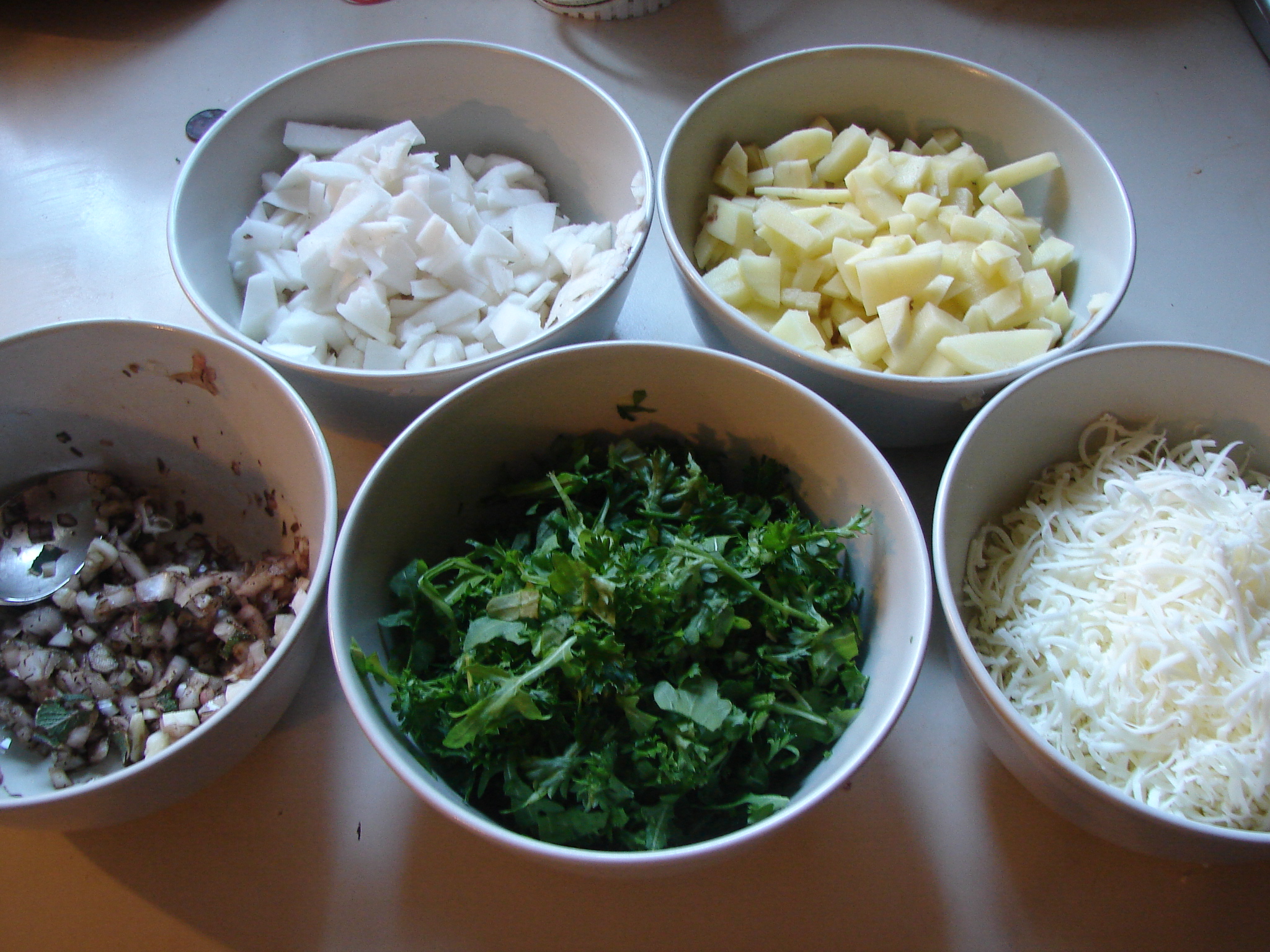 Take a lump of dough about 1 1/2 to 2 inches in diameter. Roll it out to be 7 or 8 inches wide. Top with potatoes, then turnips, then shallots, then greens, then cheese, then more potatoes and turnips. About 1 heaping tablespoon of each thing.