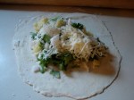Then you peel and chop very finely about 5 small turnips, 4 small potatoes, and greens of your choice. I used arugula, to go with the turnip-y pepperiness, but I think I might use baby spinach next time, if I have it. You want to end up with about 1 1/2 cups each potatoes, turnips and greens. Then you grate some cheese. Ideally I’d use gruyere, but that’s expensive and I didn’t have it, so I used sharp cheddar.