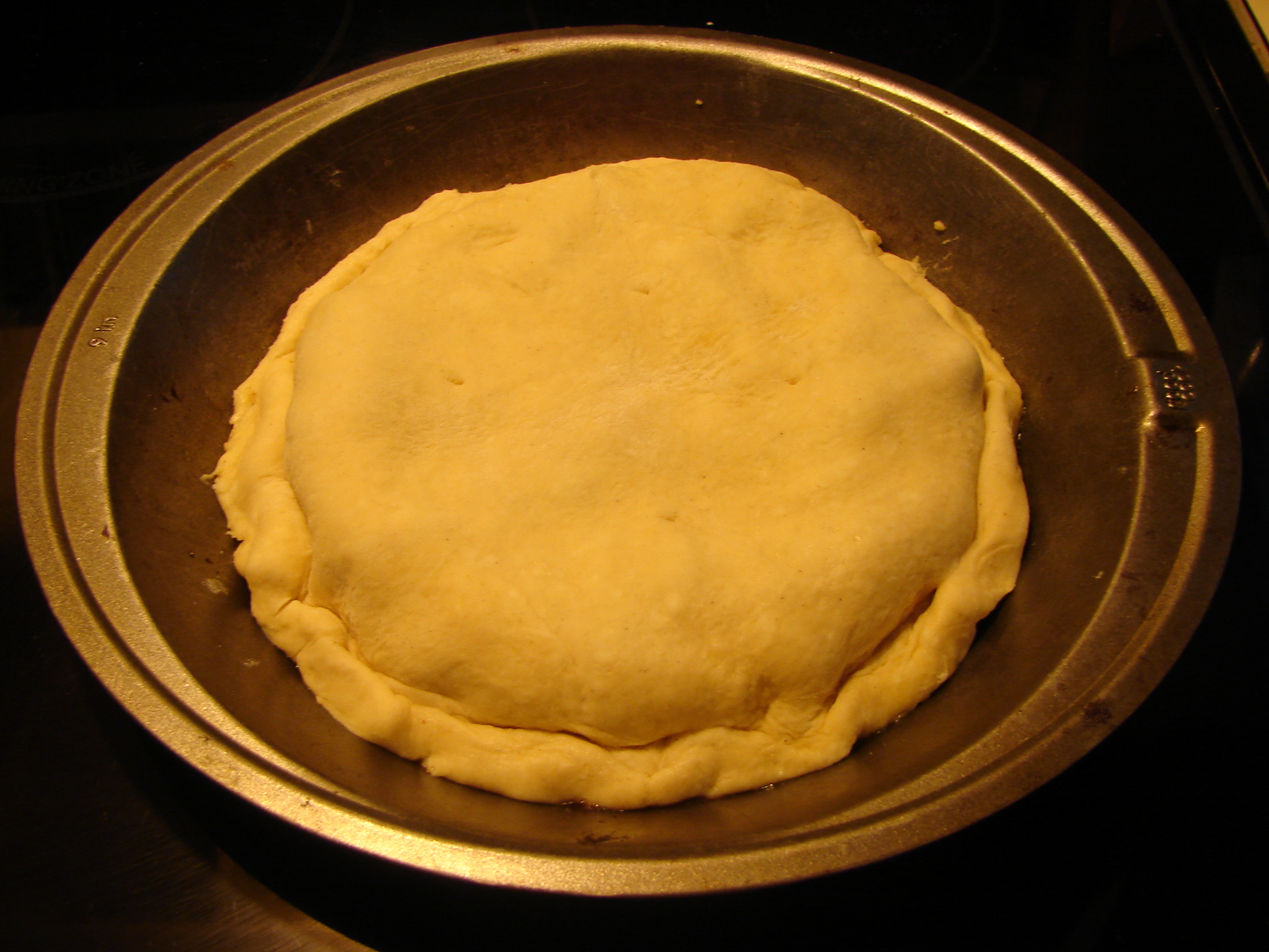 Roll out the dough to be slightly larger than your pan. It doesn’t need to be too thin, about 1/4 – 1/3 inch is fine.