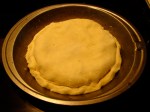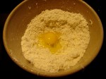 I use a richer dough for this, to make it more substantial and to balance the tartness of the tomatoes. I start with 1 1/2 cups flour, and I add salt and 1/2 t. baking powder. Then I grate in 6 T. of frozen butter, and mix it into a fine crumb. At this point I add one egg, and stir that in. You’ll need less ice water to pull this althogether – maybe 1/4 cup. Knead it very slightly, and draw it into a ball. Wrap and store in the fridge until you’re ready to use it.