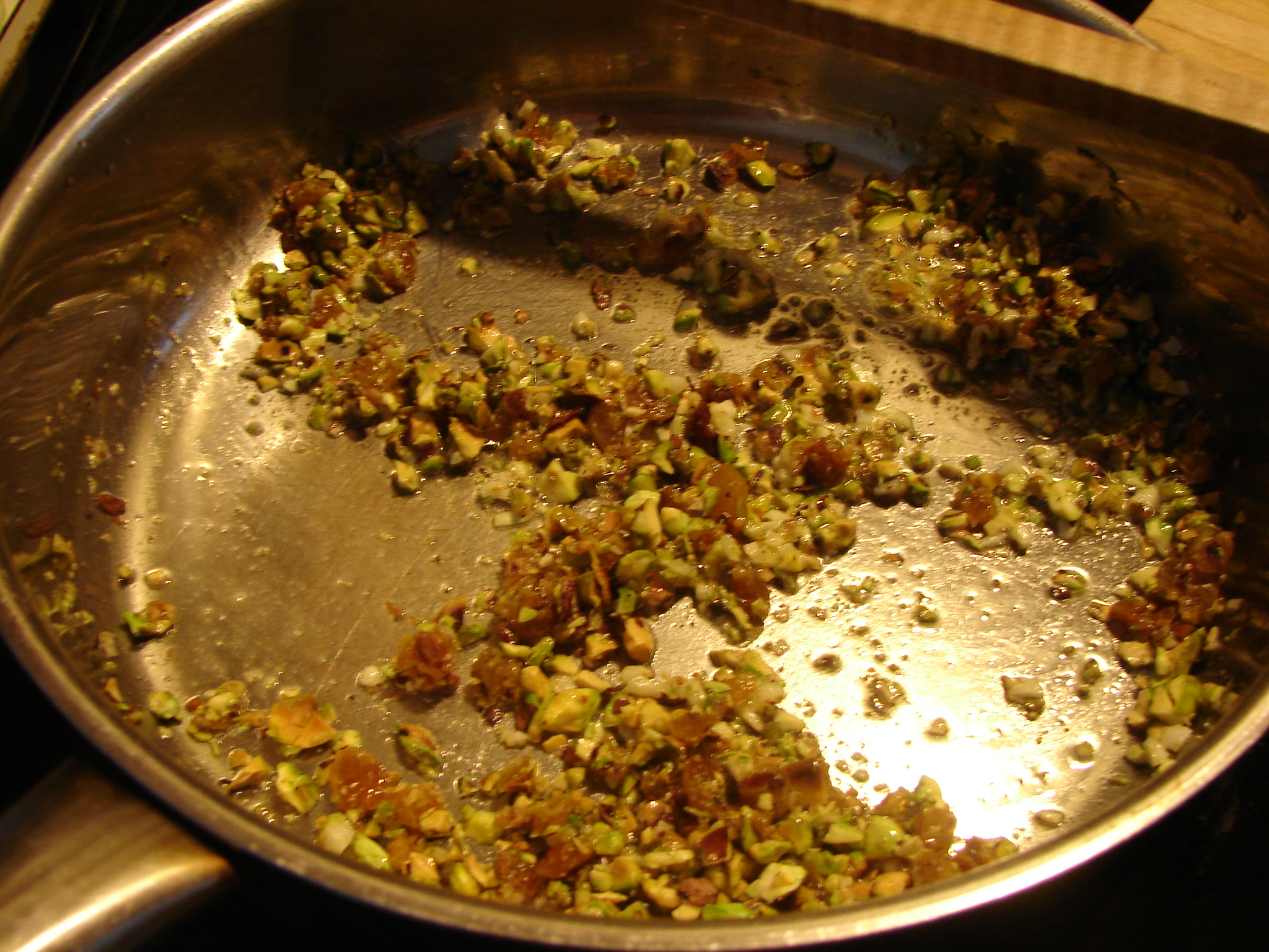 1. Warm the olive oil in a large saucepan. Add the garlic, let it sizzle a minute or so, then add the raisins and the pistachios. Don’t let anything burn!