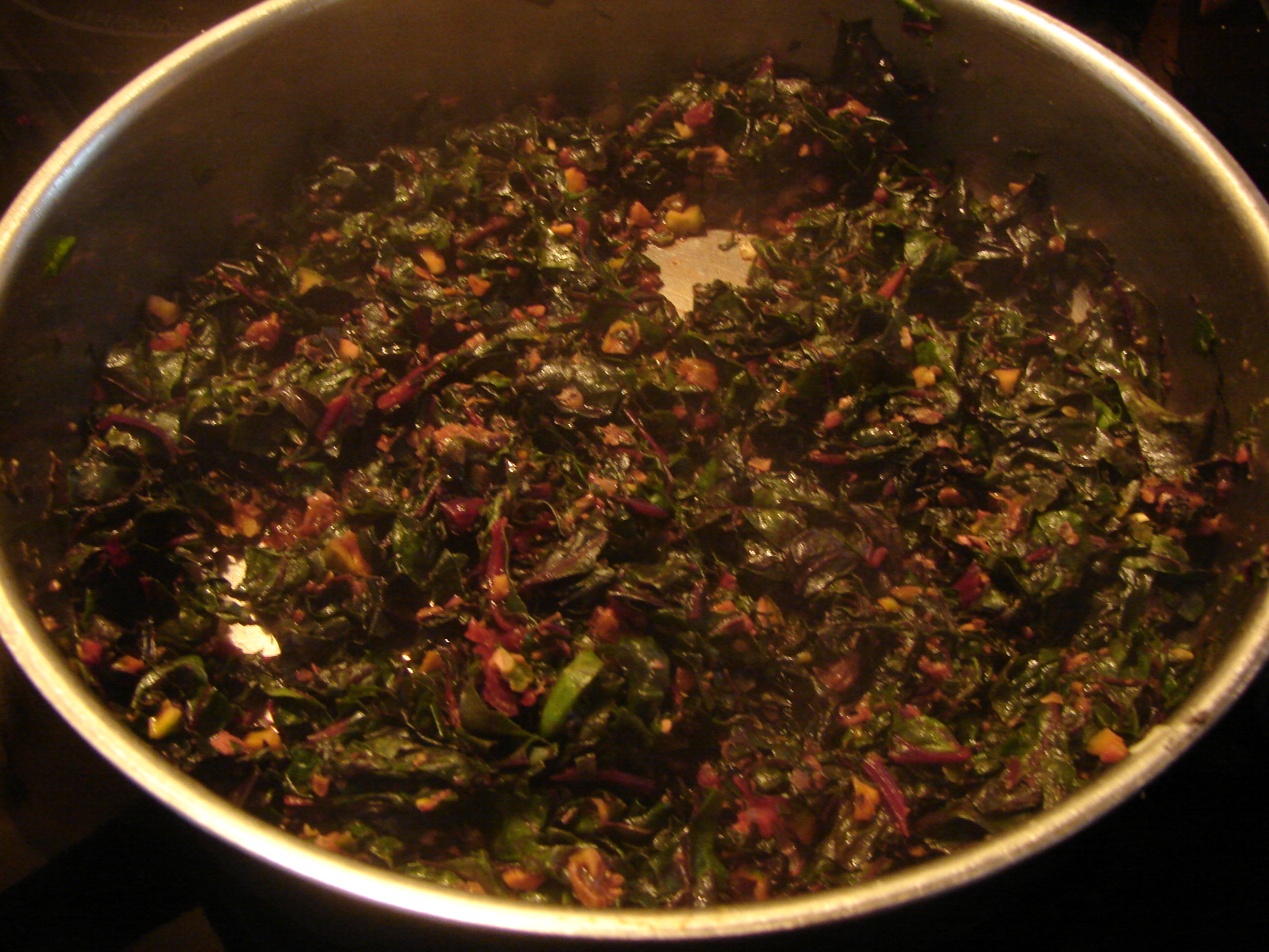 1 large bunch of swiss chard, stems removed (I use my hands rather than a knife, holding onto the stem with one hand and tearing the green of the leaves away with the other) and diced quite finely (1/2 to 1 inch squares) Should be 4 or 5 cups when you’re done.