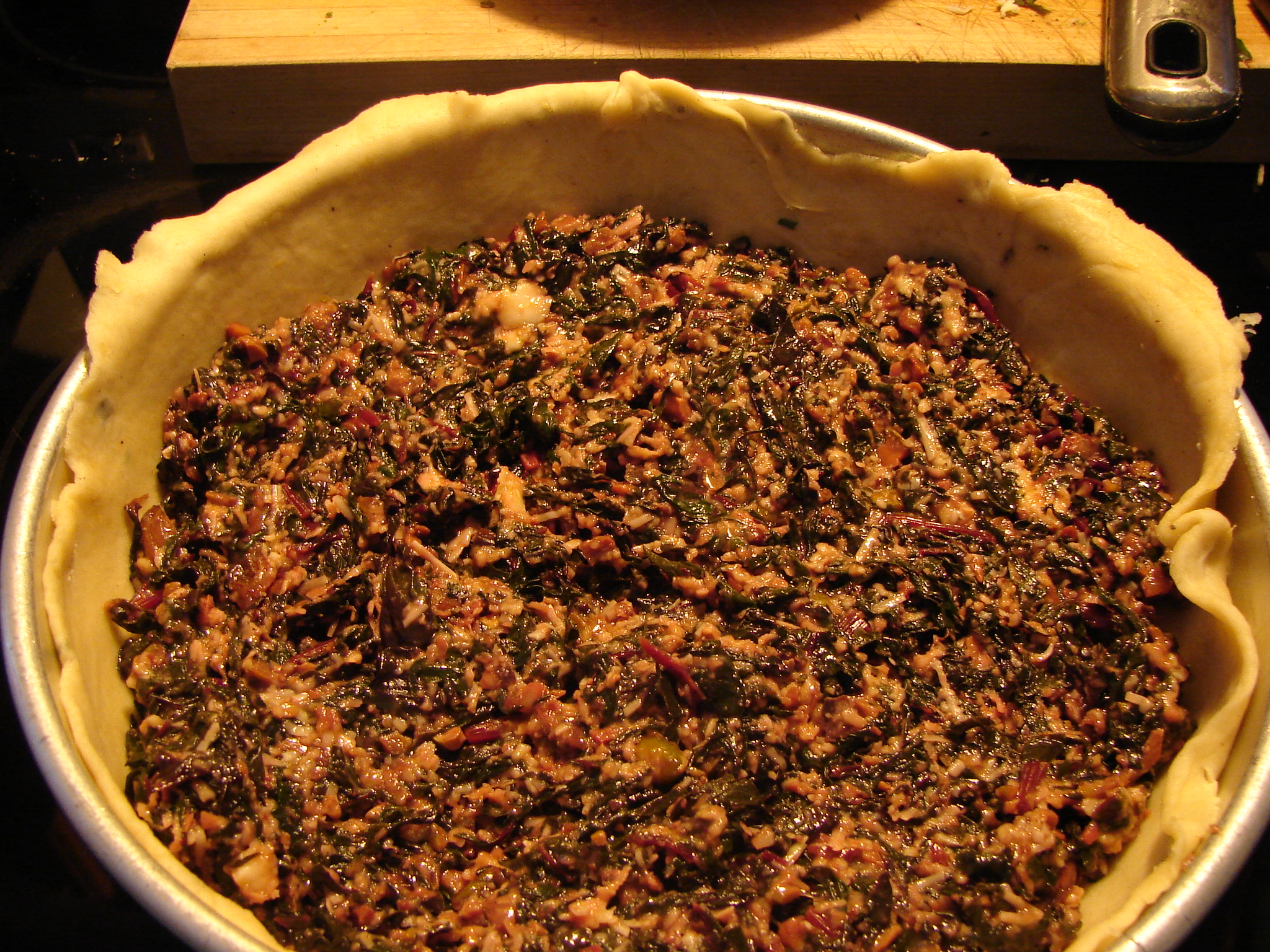 When I was in Spain quite a few years ago, I stopped at a place with only one vegetarian thing on the menu – spinach, raisins, and pine nuts. It was such a simple dish, and I had such a heaping mound of spinach on my plate, but somehow it was one of the most memorable and delicious meals I have ever eaten. The filling for this pie is loosely based on that memory. I used chard instead of spinach, because of the added depth of earthy flavor, and because it seems more substantial. And I added pistachios, quite frankly, because I had them! You could just as easily use spinach and pine nuts. The flavor would be different but equally delicious. I added lemon zest to this light yeasted crust, because I think the brightness of lemon zest contrasts nicely with the earthiness of the chard.