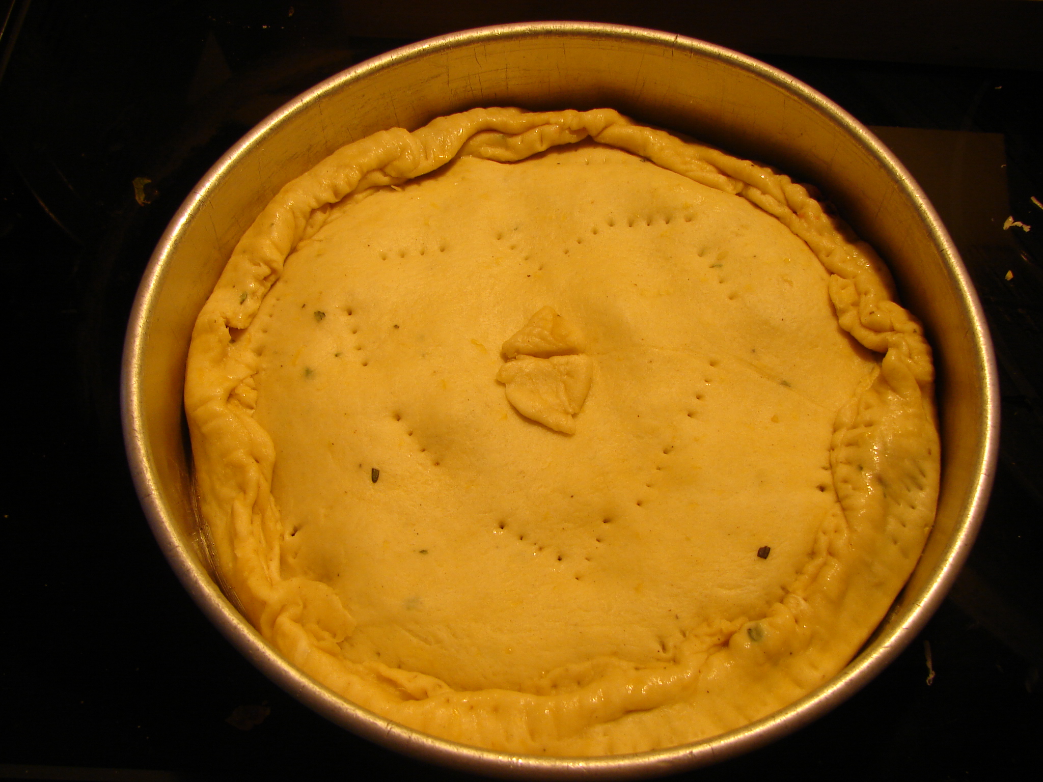 2. In a large bowl, mix the flour with the salt, rosemary (finely chopped), pepper and lemon zest. Form a hole in the center, and add the yeast & water mixture and the olive oil. Pull together into a ball, adding water as needed to make it into a smooth dough. Knead for about 5 minutes, till smooth and elastic, and then put it in a large bowl covered with a wet cloth. Set it aside to rest and ponder life as a lump of delicious dough. It will double in bulk, over a couple of hours, and become soft and pudgy, but it will never be quite as light and airy as bread dough. Just before you start to put all of the other ingredients together, punch it down and let it sit again.