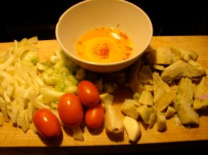 Warm the olive oil over medium low heat. Add the garlic, after a minute or two, add the leeks. When these just start to brown slightly, add the white wine, the tomato paste, and the paprika. Let this mixture get thick and syrupy, then add the art hearts, fennel, tomatoes, peas and saffron in its water. Stir to combine, and let it reduce slightly. Add a cup or two of water to make a nice broth. Bring to a boil, and then turn heat to low and let it simmer for 20 minutes or so, until the fennel is soft and all the flavors are nicely combined. Add a dollop of butter and a squeeze of lemon juice, season with salt and pepper to taste. Serve over rice, if you like.