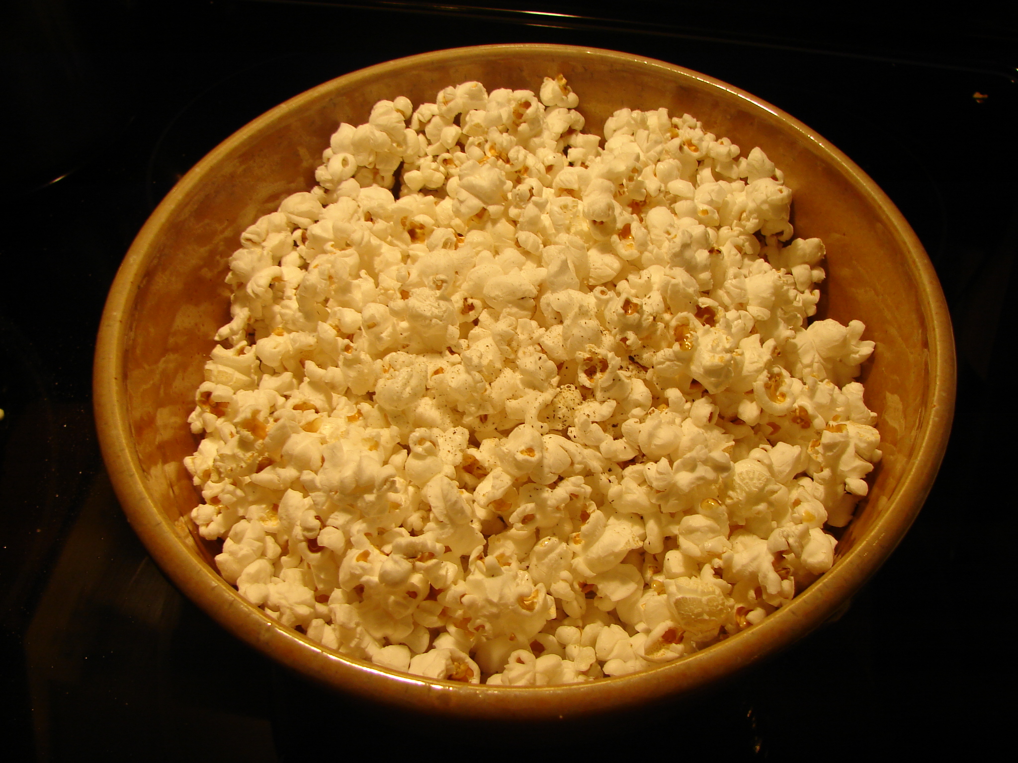I love popcorn! It’s the one food I really can’t resist. The one food I’ll eat even if I’m already full. Strange but true. I even like horrible movie popcorn, and microwave popcorn, and popcorn out of a bag with strange cheese-flavored powder on it. How do you like your popcorn? Do you like it salty? Sweet? Salty and sweet? Coated in sticky caramel and packed in a box with a toy in it? When I was in college we doused it with goyo adobo seasoning. I’ve put curry powder or other spice mixes right into the oil as it cooked, infusing every bite with flavor. But I like it best popped in olive oil on top of the stove, and generously sprinkled with sea salt and a shake of freshly ground pepper. If, like my husband, you consider it packing material, you can still revel in the fact that popcorn is the inspiration for some of the best songs ever!