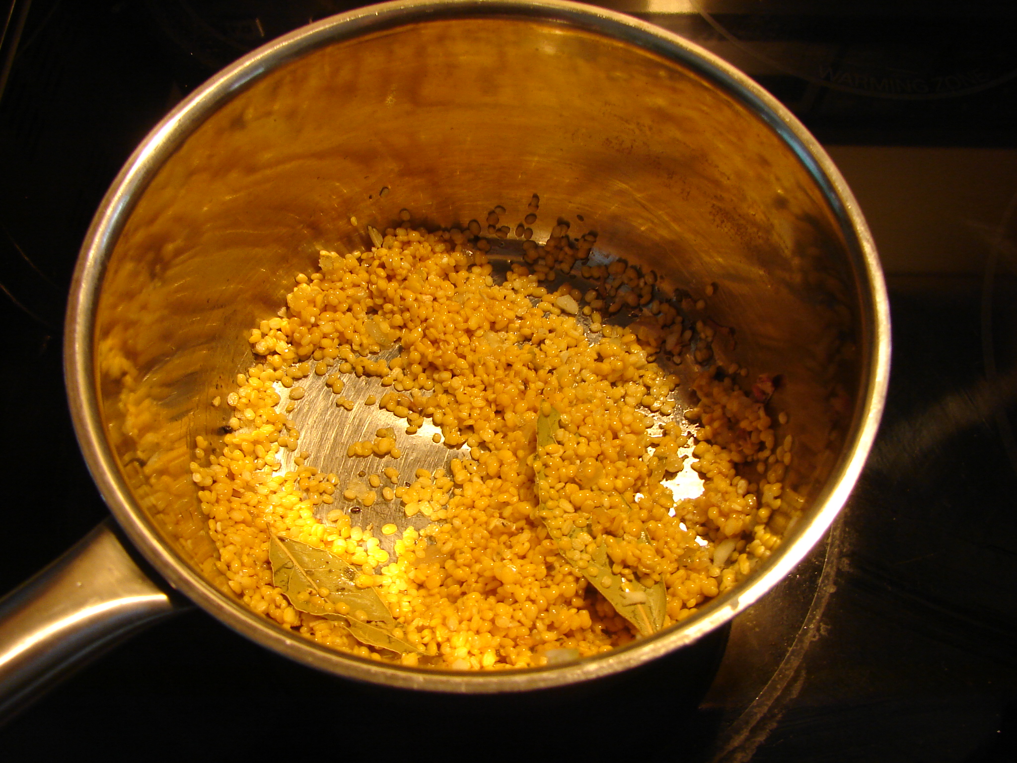 1. Over medium heat, fry the shallot and then the garlic until they begin to brown, toss in the bay leaves and marjoram, to coat in oil. Add the moong dal (picked through, rinsed, and drained). Stir to coat in oil.