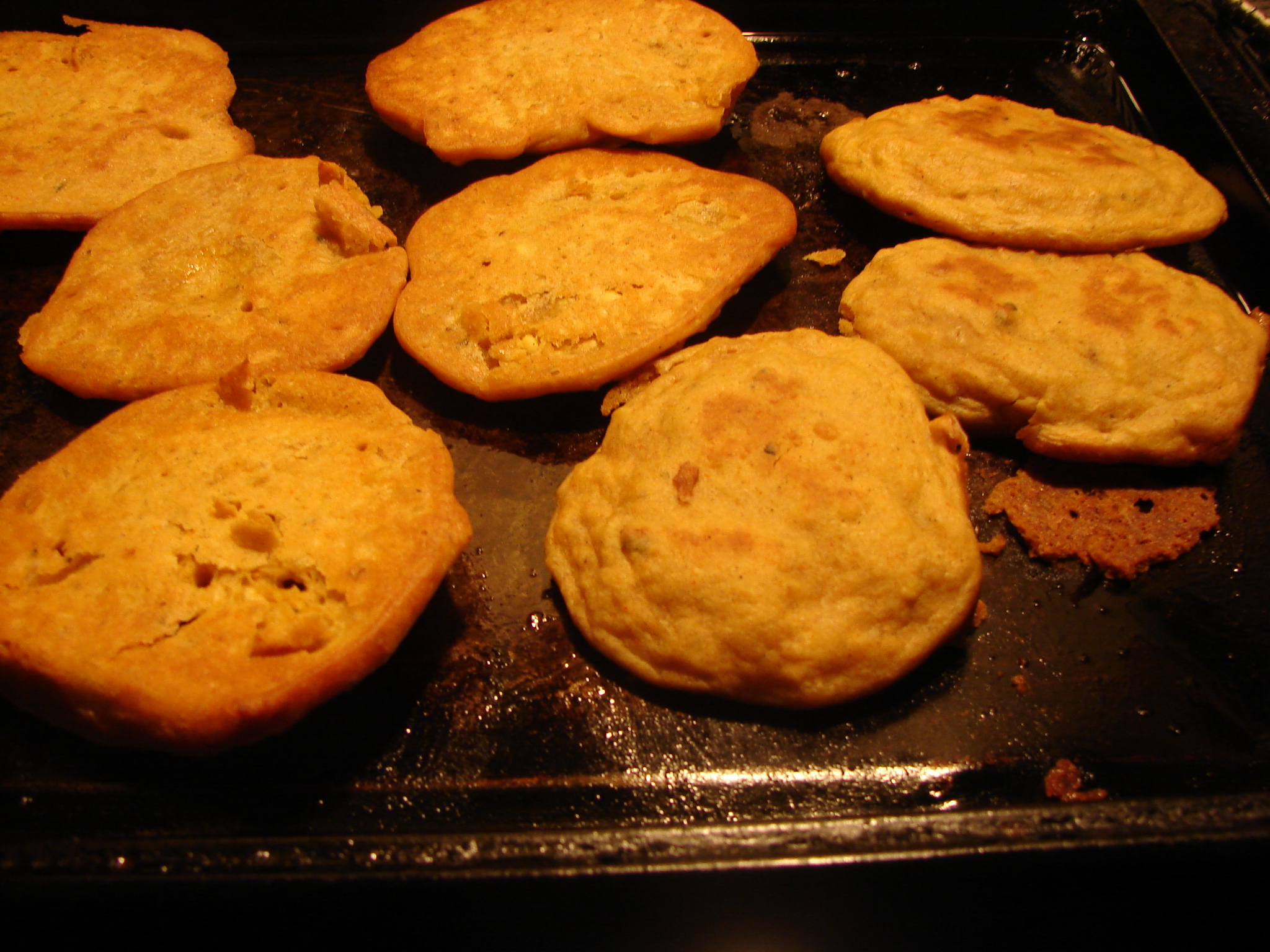 4. Coat a baking sheet lightly with olive oil, and preheat the oven to 425. Drop the batter by heaping tablespoonfuls onto the sheet, spreading them out a bit, and leaving an inch or two between them. Cook for about twenty minutes, until they’re brown on top. 3/4 of the way through, flip them over, so both sides get nicely brown and slightly crunchy.