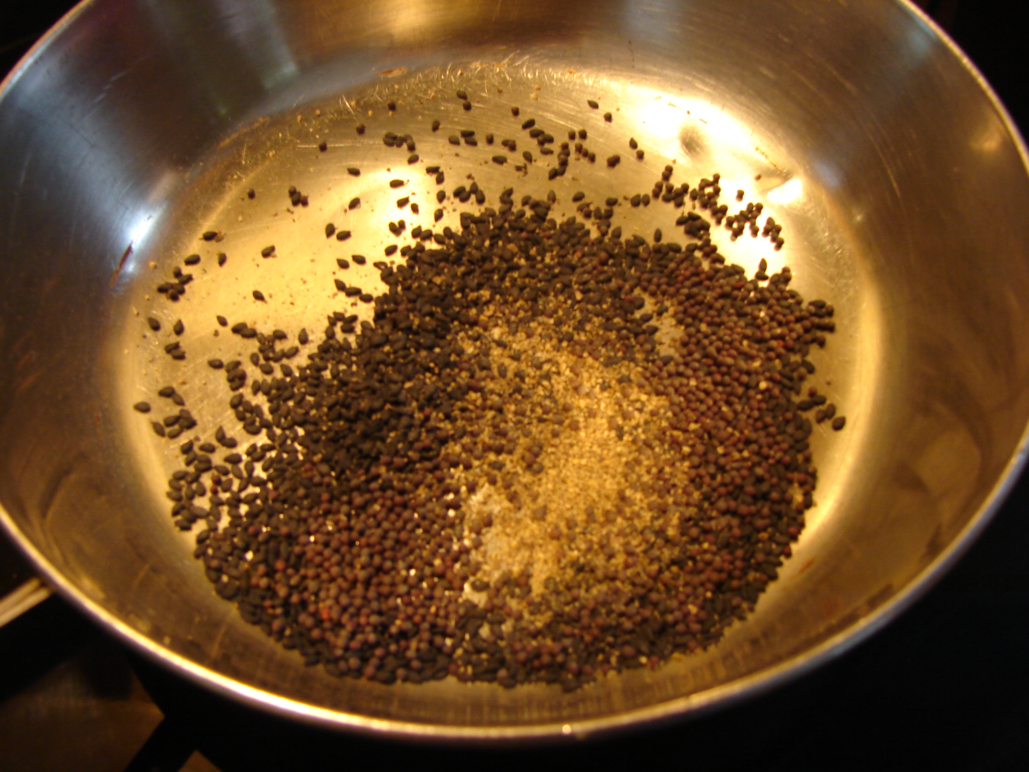 1. Toast the sesame seeds, mustard seeds and pepper in a small saucepan until the mustard seeds begin to pop, and everything starts to smell very aromatic.