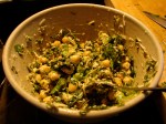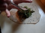 3. Make the filling. Dice the shallot, garlic, jalapeno, and ginger together so that they’re very very very fine. You can even use a processor if you feel so inclined. Warm the olive oil, and then add the shallot/garlic/hot pepper/ginger mixture, and cook for a few minutes, stirring, until it starts to smell good and turn brown a bit. Add the sugar and tamarind, and tamari. Add the spinach and cook until it wilts and the pan starts to dry up. Turn it into a bowl and mix with the chickpeas and cheese, and season with salt and pepper.