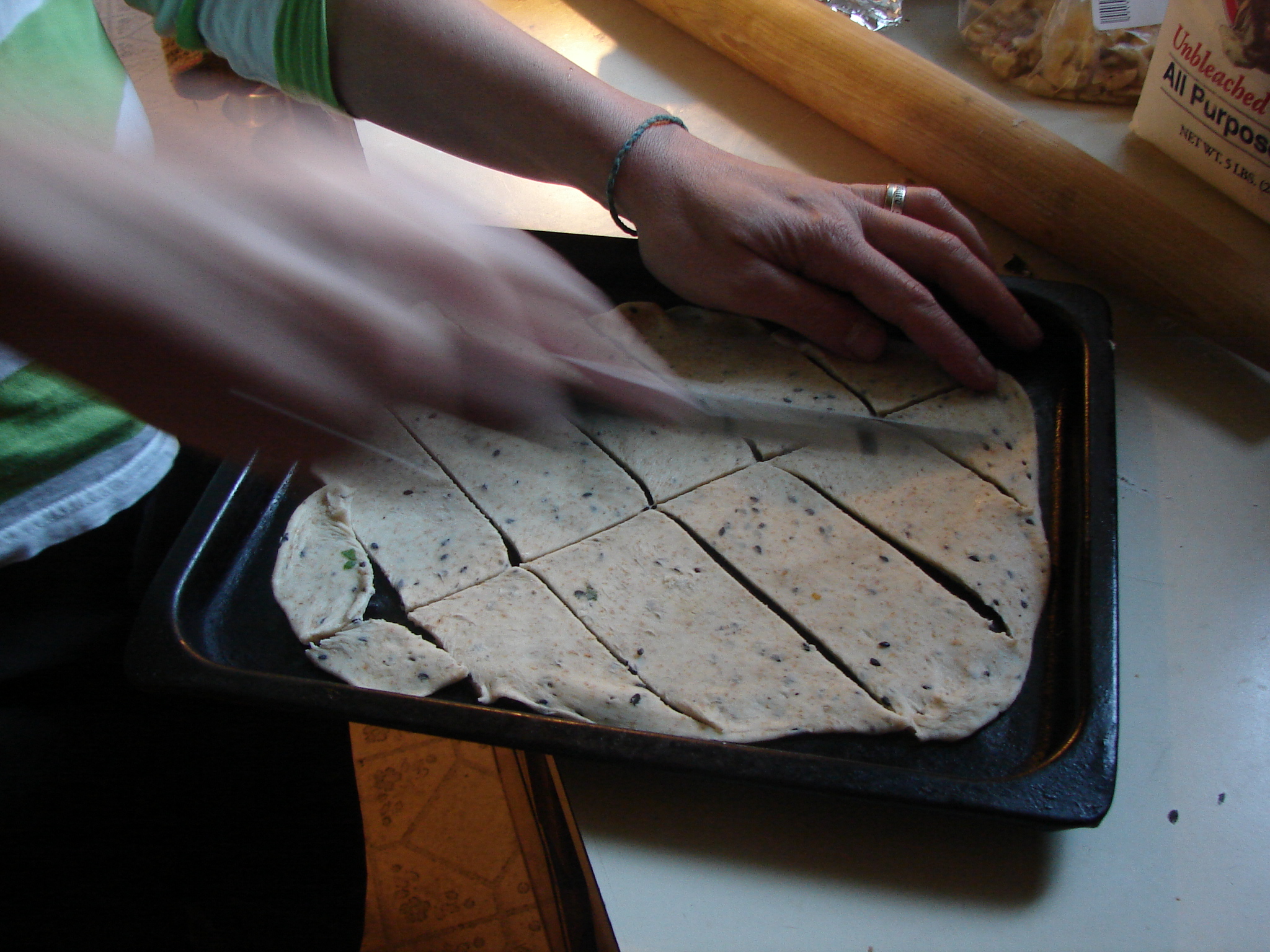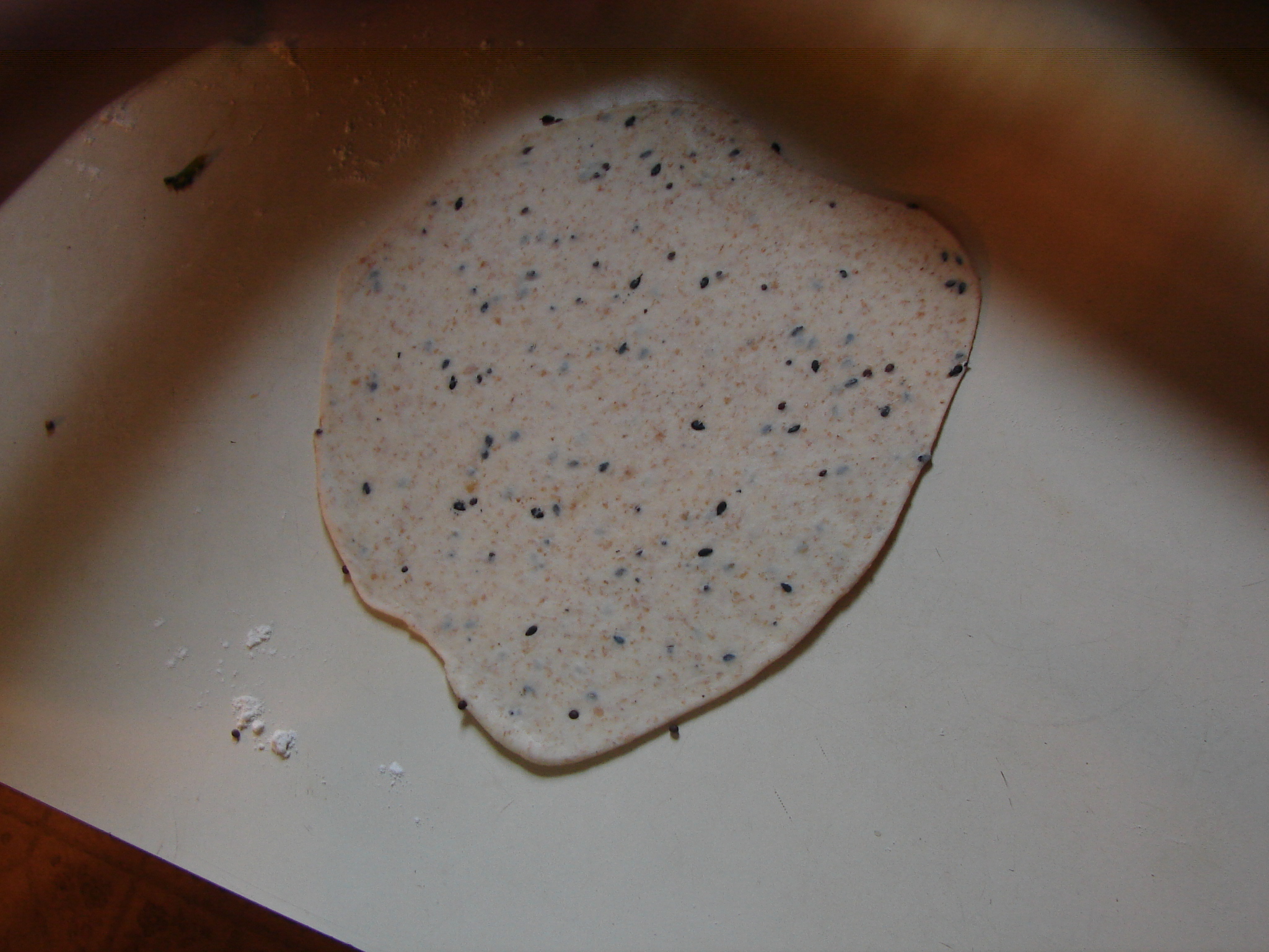 2. Mix the flours, the salt, and the pepper and seeds in a large bowl. Add the butter and oil, and rub between your fingers until everything is thoroughly mixed. It might seem a bit sandy at this time, and that’s okay. Add warm water, about 1/2 cup (but start with less) to make a workable dough. Put it onto the counter and knead it until it’s smooth, just a few minutes, adding a little flour if it gets too sticky. Refrigerate until you’re ready to use it.