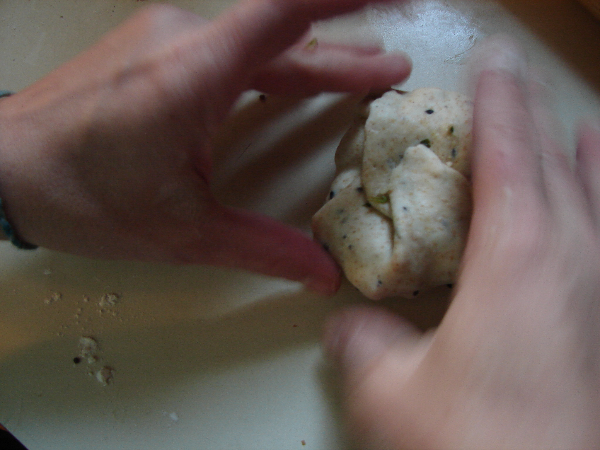 These aren’t the kind of dumplings you float in a stew! Rather, this is how I imagine the dumplings that Kung Fu Panda fights over. They have a light crust, studded with black sesame seeds, black mustard seeds and black pepper. (I love this combination just because they’re so pretty in the pan together!) And a simple filling of spinach, chickpeas, cilantro and a bit of cheese. They’re fun to make and fun to eat! I have to admit that I completely messed up this crust at first, but, proving that crust is forgiving, I added a few ingredients, gave myself a day to get over the frustration, and it worked perfectly.