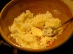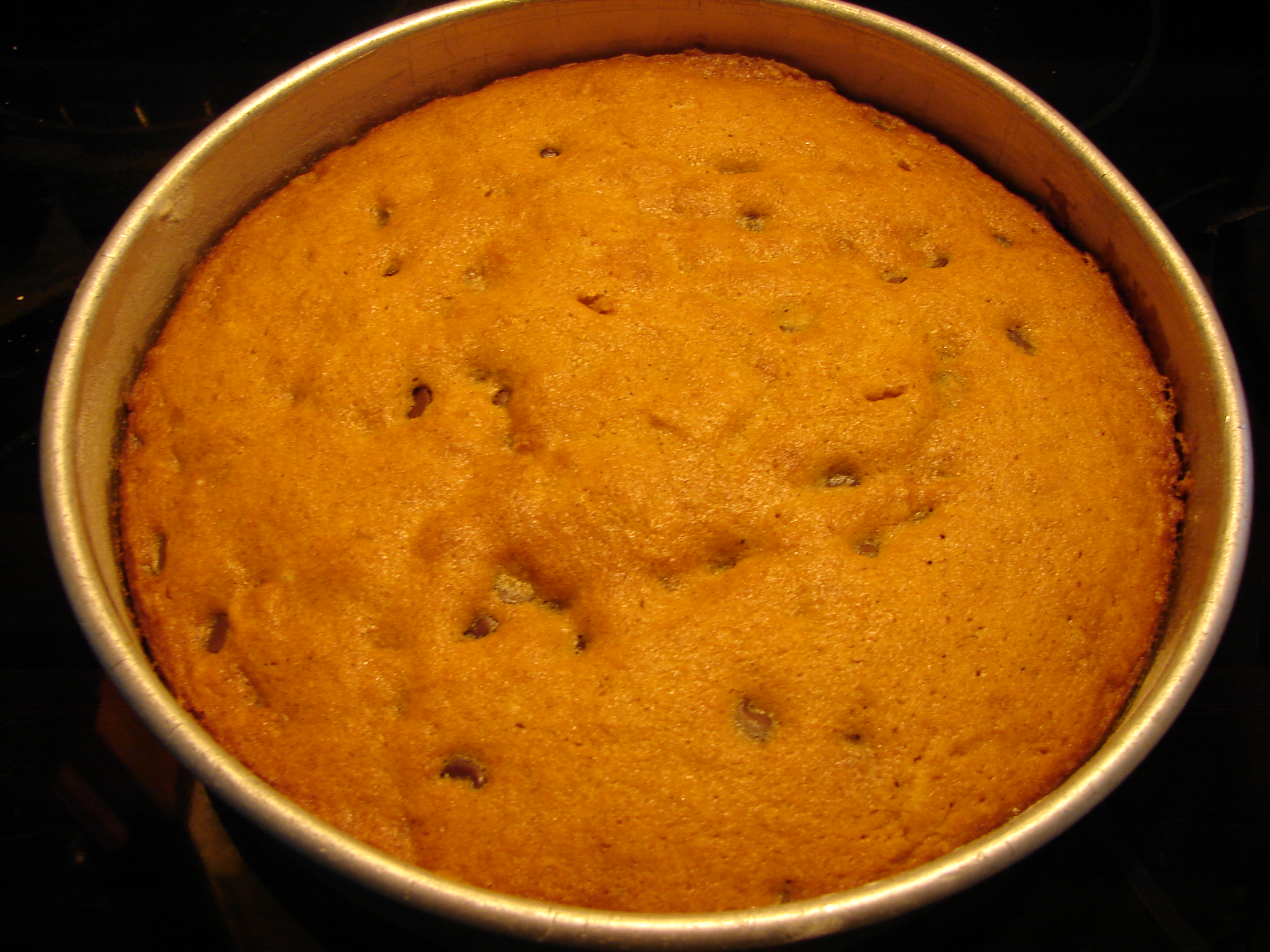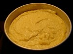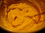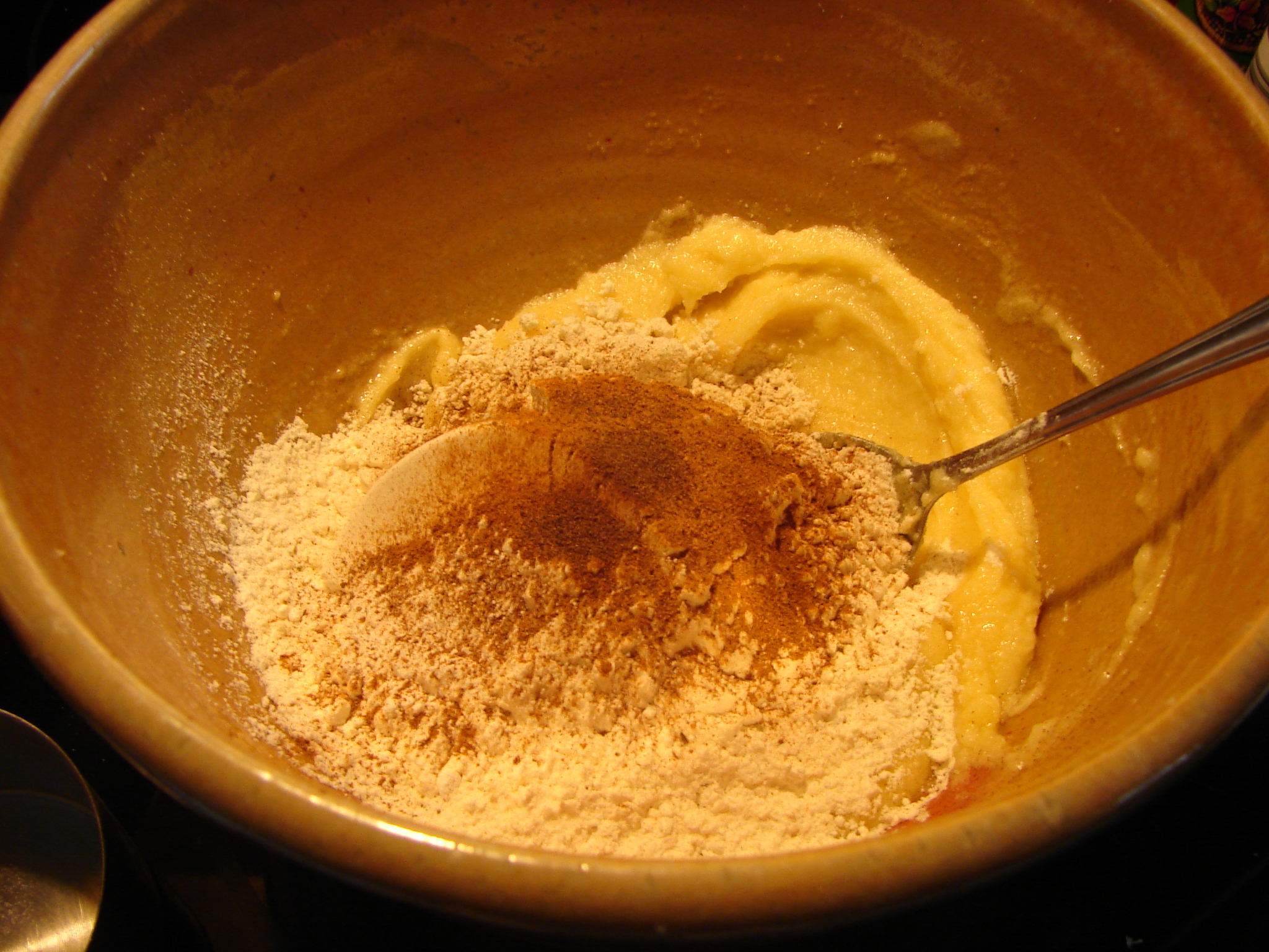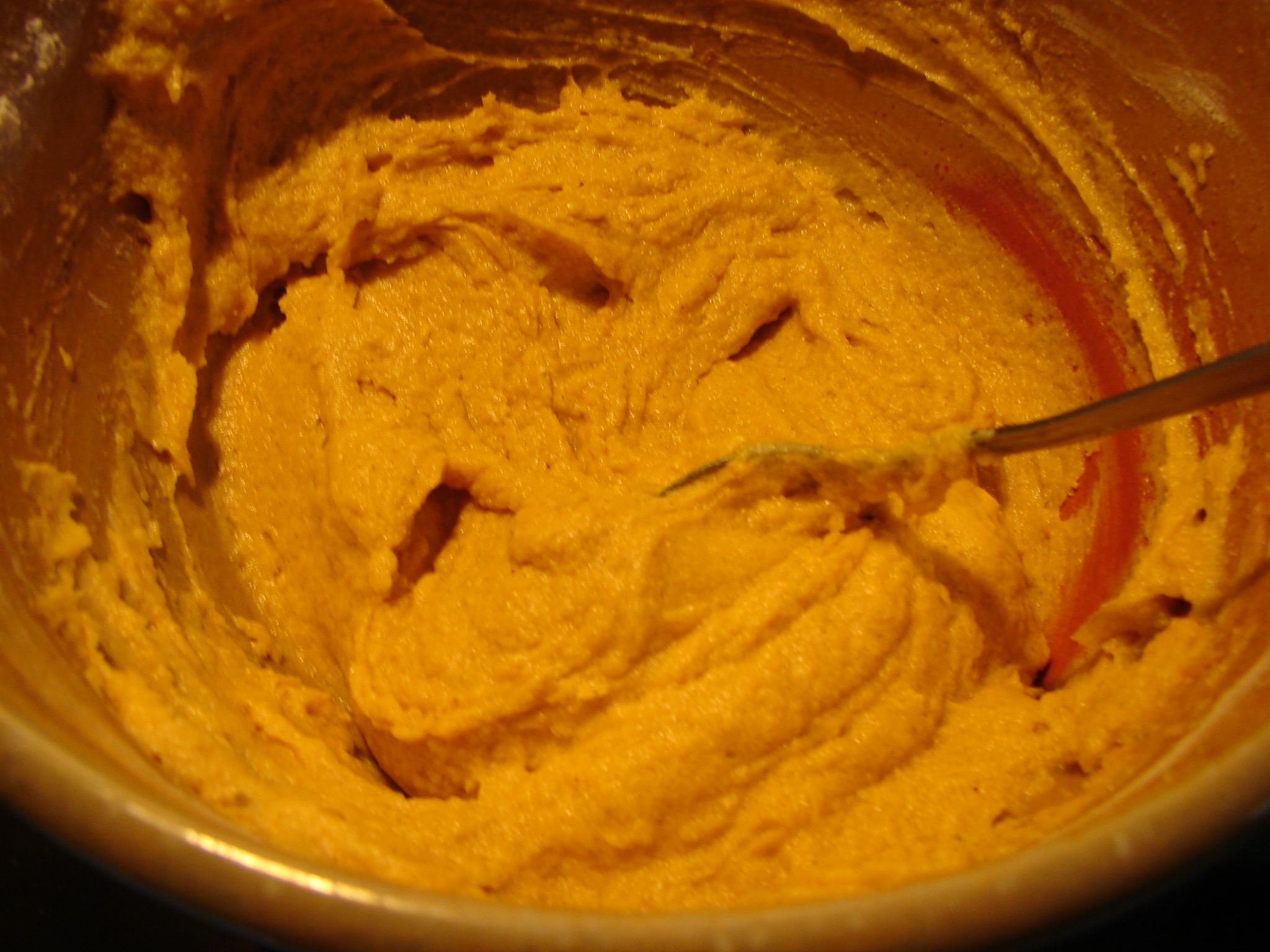 4. Mix this all together. At this point it will be quite thick, and you need to add some moisture. For your average cake, or the coconut almond cake, you’ll add milk. Up to about 1/2 a cup, but stir it in for the correct texture. For the pumpkin cake, the pumpkin itself (I used 3/4 cup pumpkin puree) will be the moisture, so you don’t need to add milk. Stir it all together until you get a light, pourable but still thick batter. About the texture of whipped cream. Now if you’re adding nuts or chocolate chips, do so. If you’re adding fruit, like bananas or apples, this will be the moisture that you need, and you shouldn’t need to add milk.