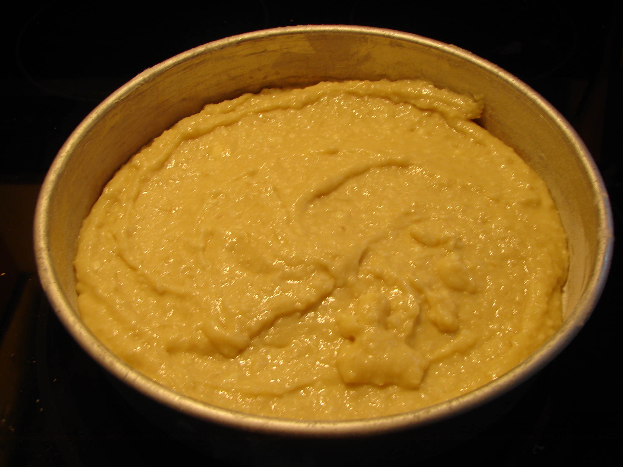 5. pour into baking pans that have been greased and floured, or, ideally, have a circle of parchment paper on the bottom. I used 10 inch pans, because that’s what I have, but this recipe is probably better suited to smaller pans. 8 inch, maybe, so the cakes seem a little taller at the end. If you wanted a crumb topping, you’d sprinkle that over now.