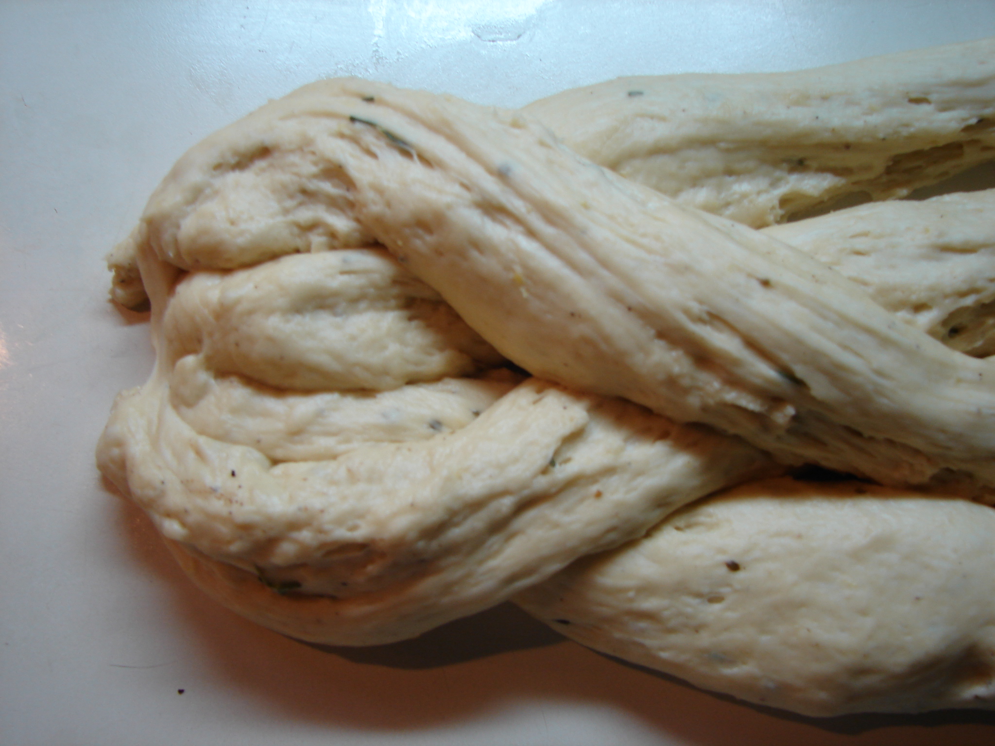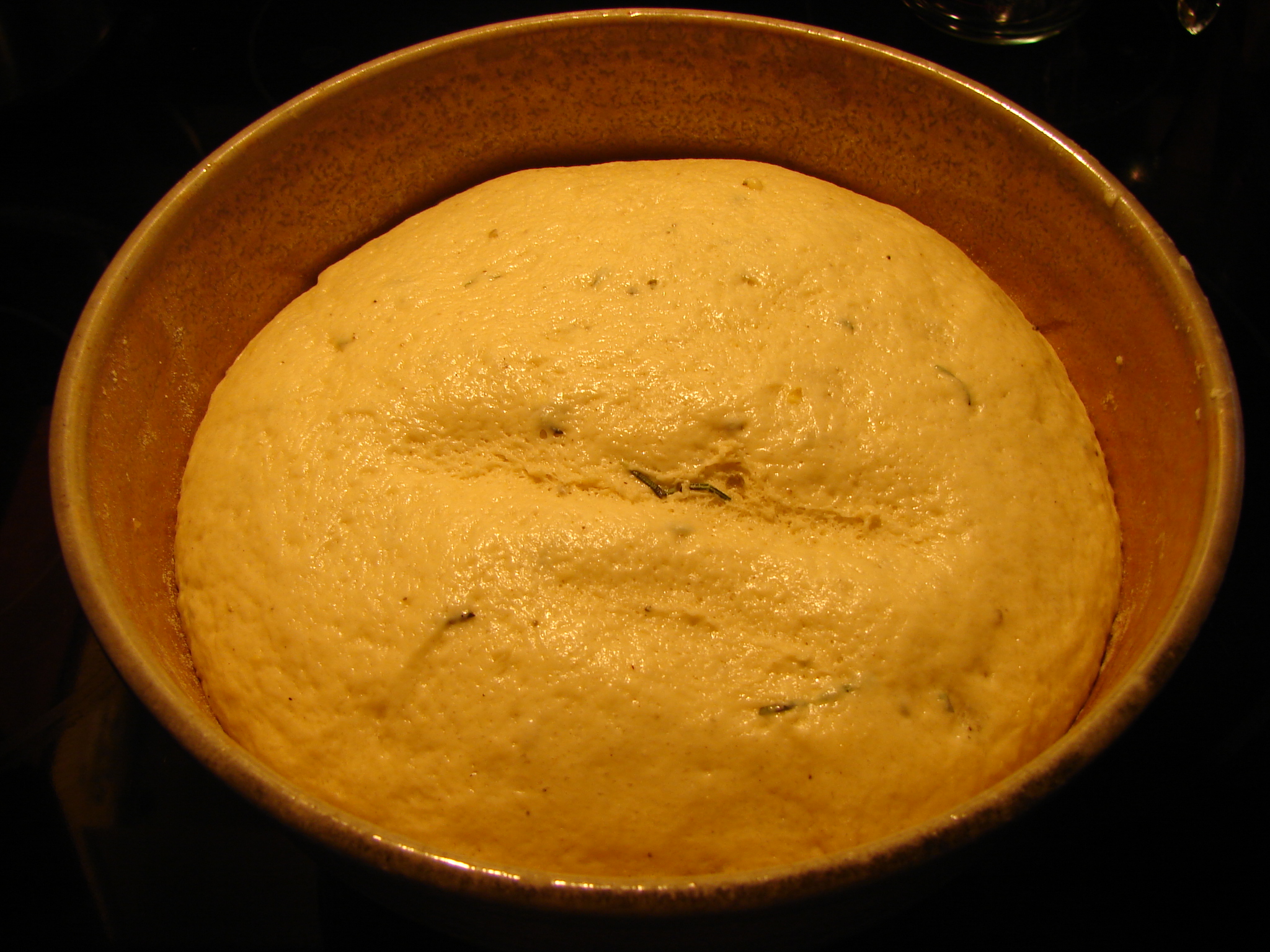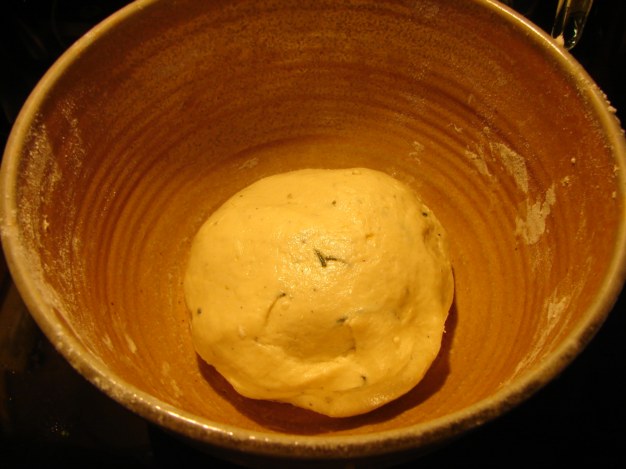3. In a large bowl, combine the flour the rest of the salt, and the rosemary mixture. Make a well in the center and add the egg, the softened butter (1 T at a time) and the milk & yeast. Stir it all together, and add warm water, just enough to form a nice ball of dough. Knead it for 5- 10 minutes until it’s smooth and elastic. Put a little olive oil in a bowl, and put the kneaded dough in, turning it all around so it’s coated with oil. Cover with a damp cloth and put in a warm place to sit until it’s doubled in bulk. About 1 1/2 hours should do it.
