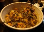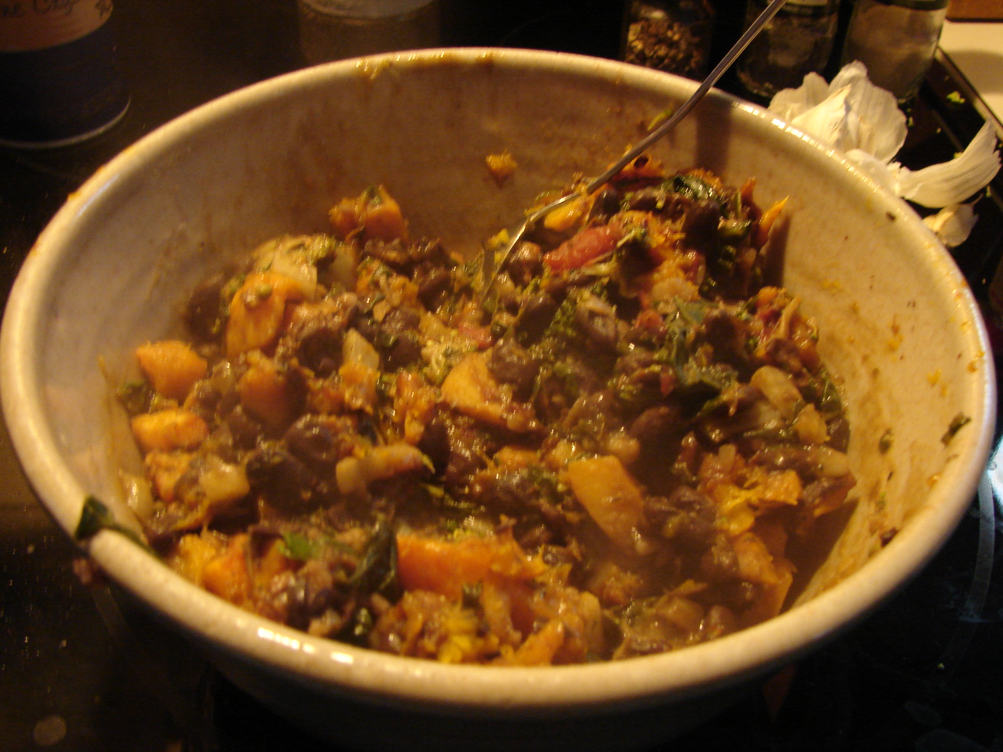 2. In a large saucepan over medium heat, warm the oil, fry the shallots and then the garlic until they start to brown. Add the oregano and red pepper flakes. Add the fennel and cook until it’s translucent and starting to brown slightly. Add the chipotle puree, stir to coat. Add the black beans and stir everything together. Cook for a few minutes, and then add enough water to make a saucy sauce. Add the spinach and cook until the pan starts to dry out. Add the broccoli, cover, and cook just till it starts to turn bright green.