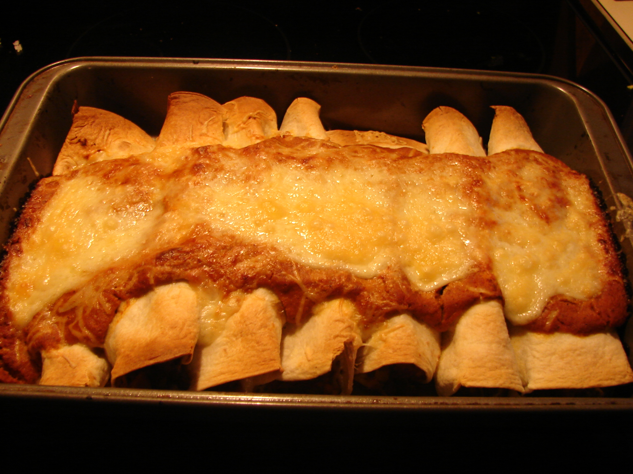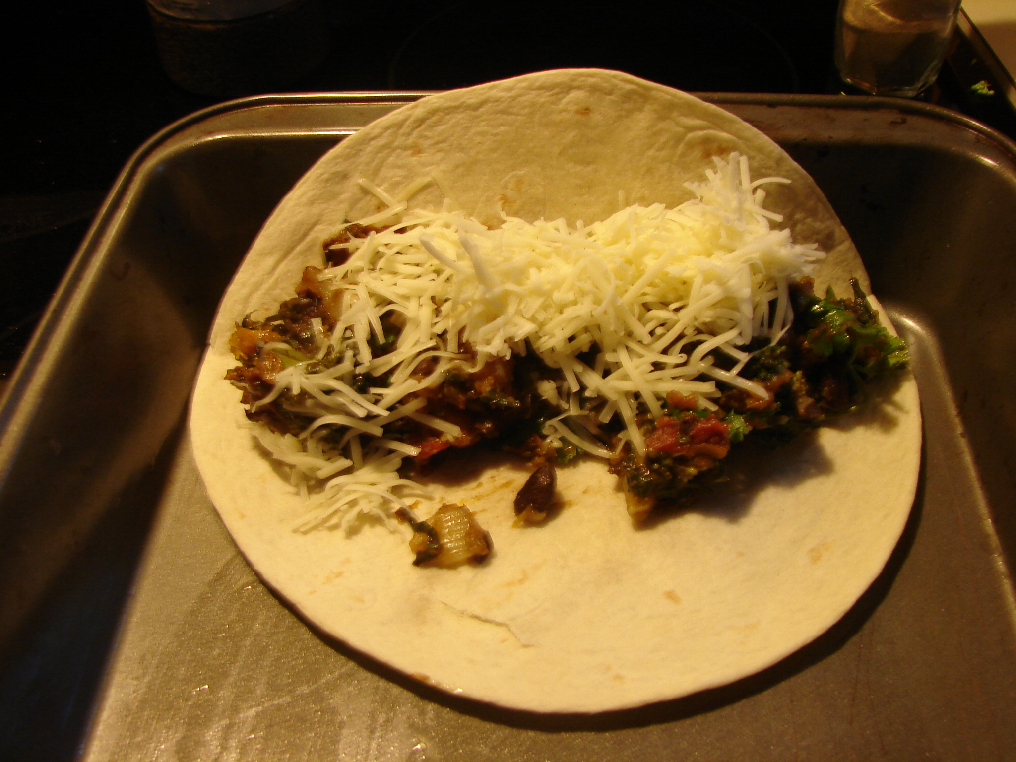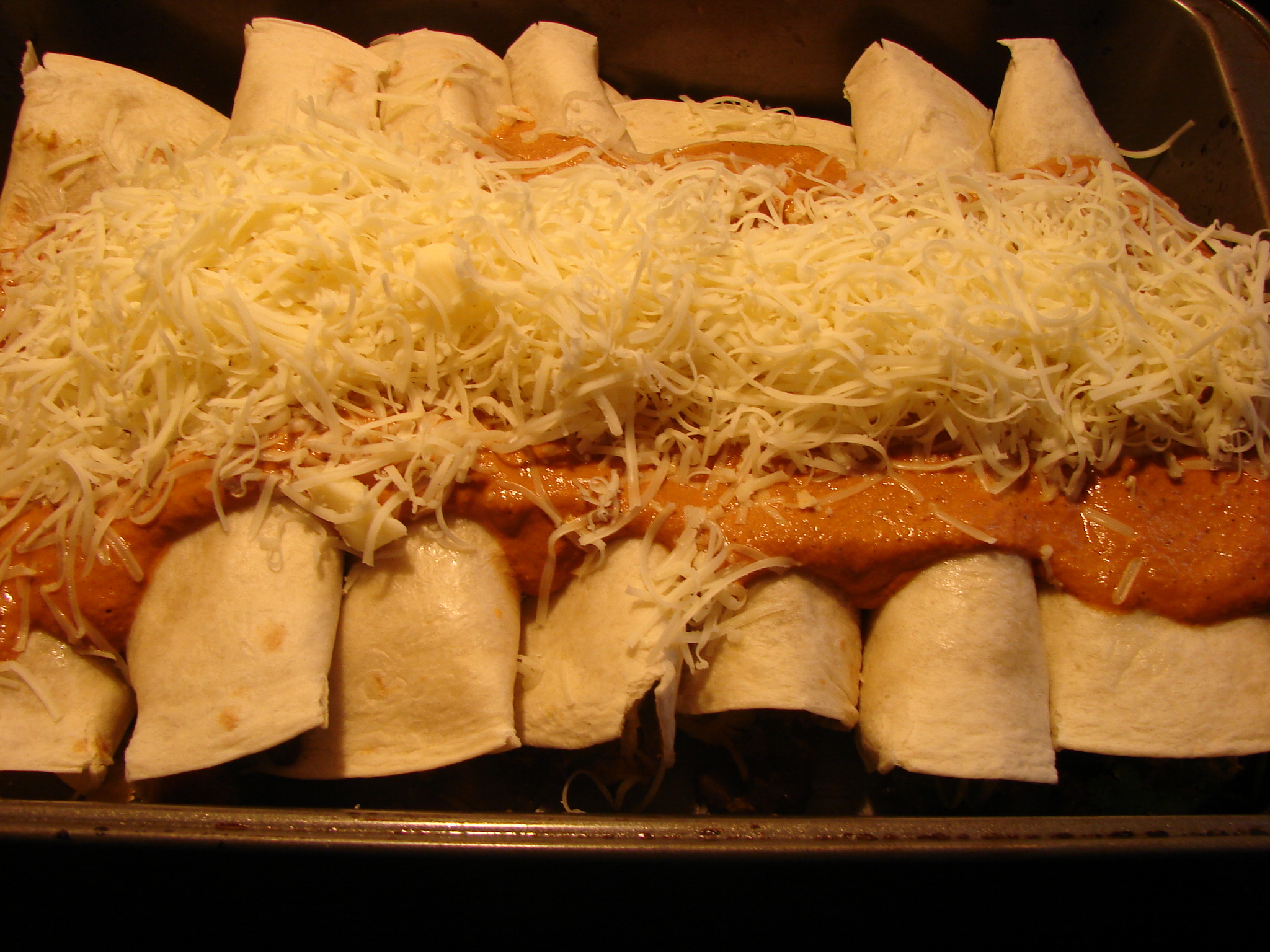 5. Lightly oil a baking dish. Put a warm tortilla in (I warm them in the toaster oven while I’m cooking everything else.) Put a line of filling in the center…about an inch thick all the way along. Add cheese to cover. Then roll it up and put it face-down in the pan.