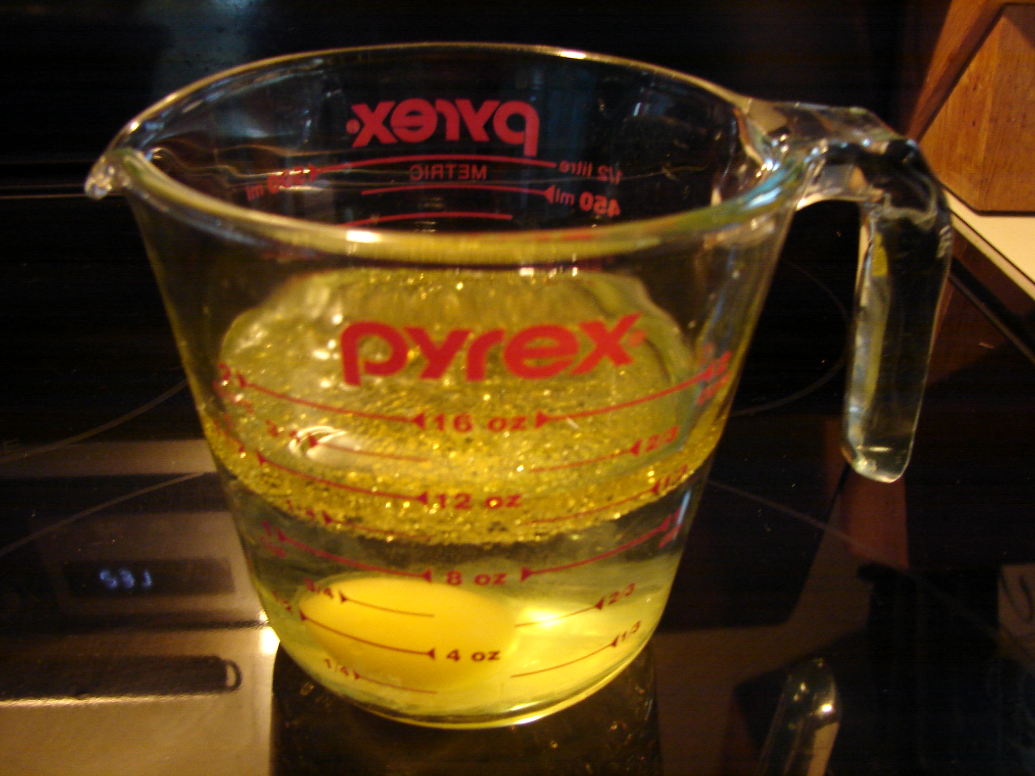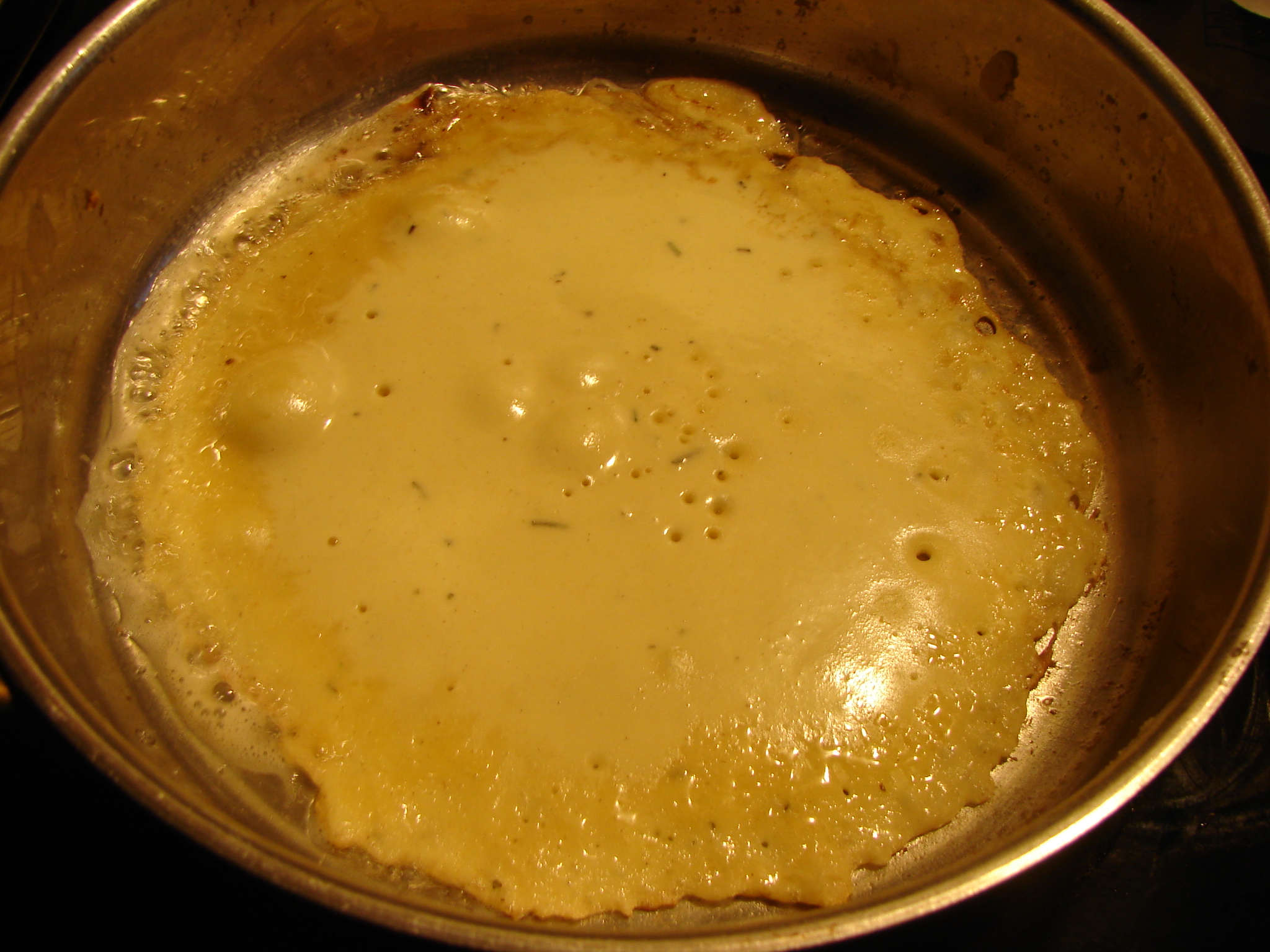 Then… Warm some butter or olive oil in a large frying pan. Butter is easier to work with, I find, but olive oil is more…vegan. Add about 1/2 cup batter – enough so that when it spreads out, there’s still some space all around the edges. This helps when you’re trying to get your spatula under to flip it, and it allows the edges to get nice and crispy.