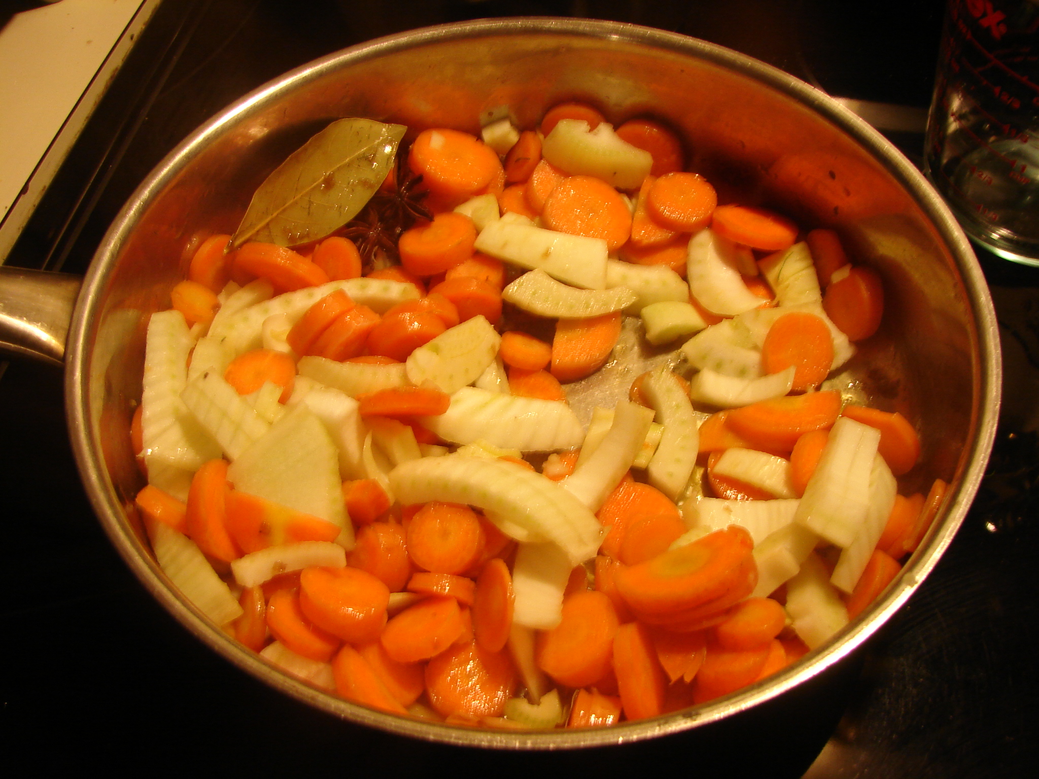 1. Warm the butter and sugar in a large frying pan over medium-high heat. When the butter starts to bubble, add the bay leaves and the star anise. Stir them for a minute or two, and then add the vegetables