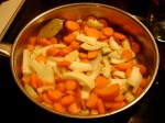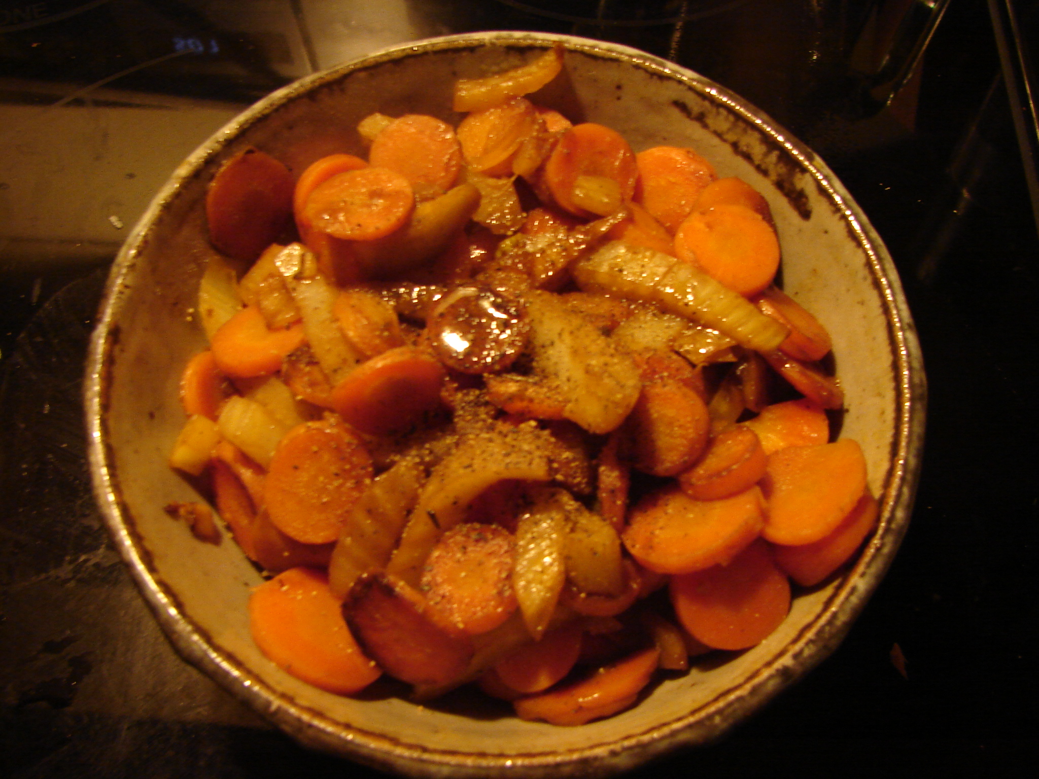 3. Add the wine, and stir everything together. Add water to cover (about 1/2 cup should do it) Cover the pan partially, and cook until the carrots and fennel are tender but still crunchy. Remove the veg from the pot, add a little water, and cook until the liquid is thickish and syrupy. Pour it over the carrots and fennel (discarding the bay leaves and star anise). Add salt and plenty of pepper, and serve!