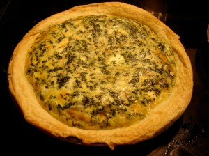 1 recipe paté brisée. This recipe makes enough for 2, so if you’re only making one, half everything! You’re going to roll this about the size of your pie plate, then press it in, and crimp the edges with a fork to make sure they’re all on the plate. I don’t usually cut off excess, I just mold it to fit wherever I want it to go. Poke the crust in the middle with a fork a few times so it doesn’t puff up when you bake it. Now blind bake the crust for ten or fifteen minutes in a preheated 425 degree oven. That is…bake it empty, until it’s slightly set.