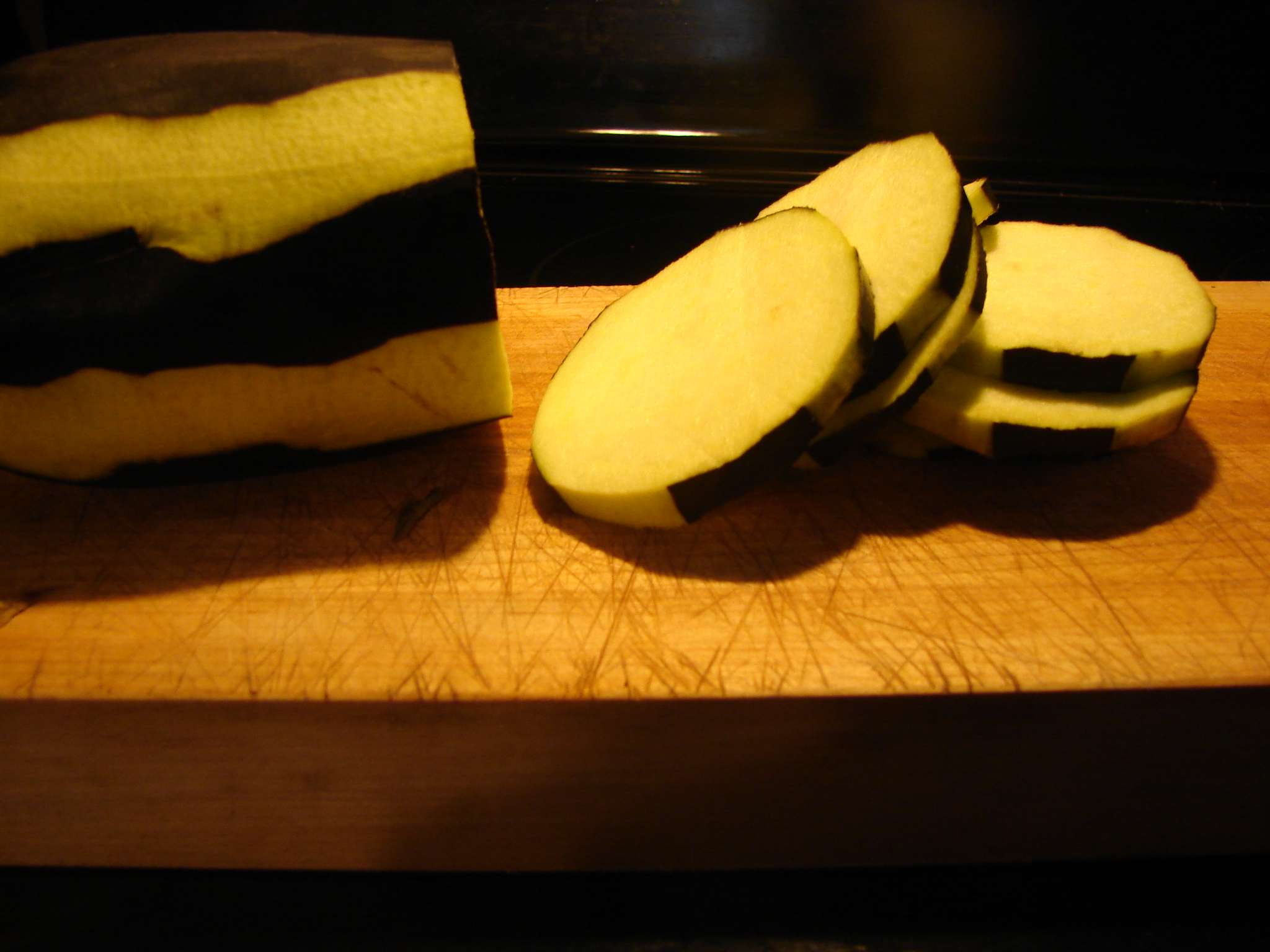 1. Peel four long slices of skin, lengthwise, and then cut the eggplant in 1/4 inch slices. You can cut crosswise to make circles, or lengthwise to make long slices, depending on your intentions for the finished epplant.