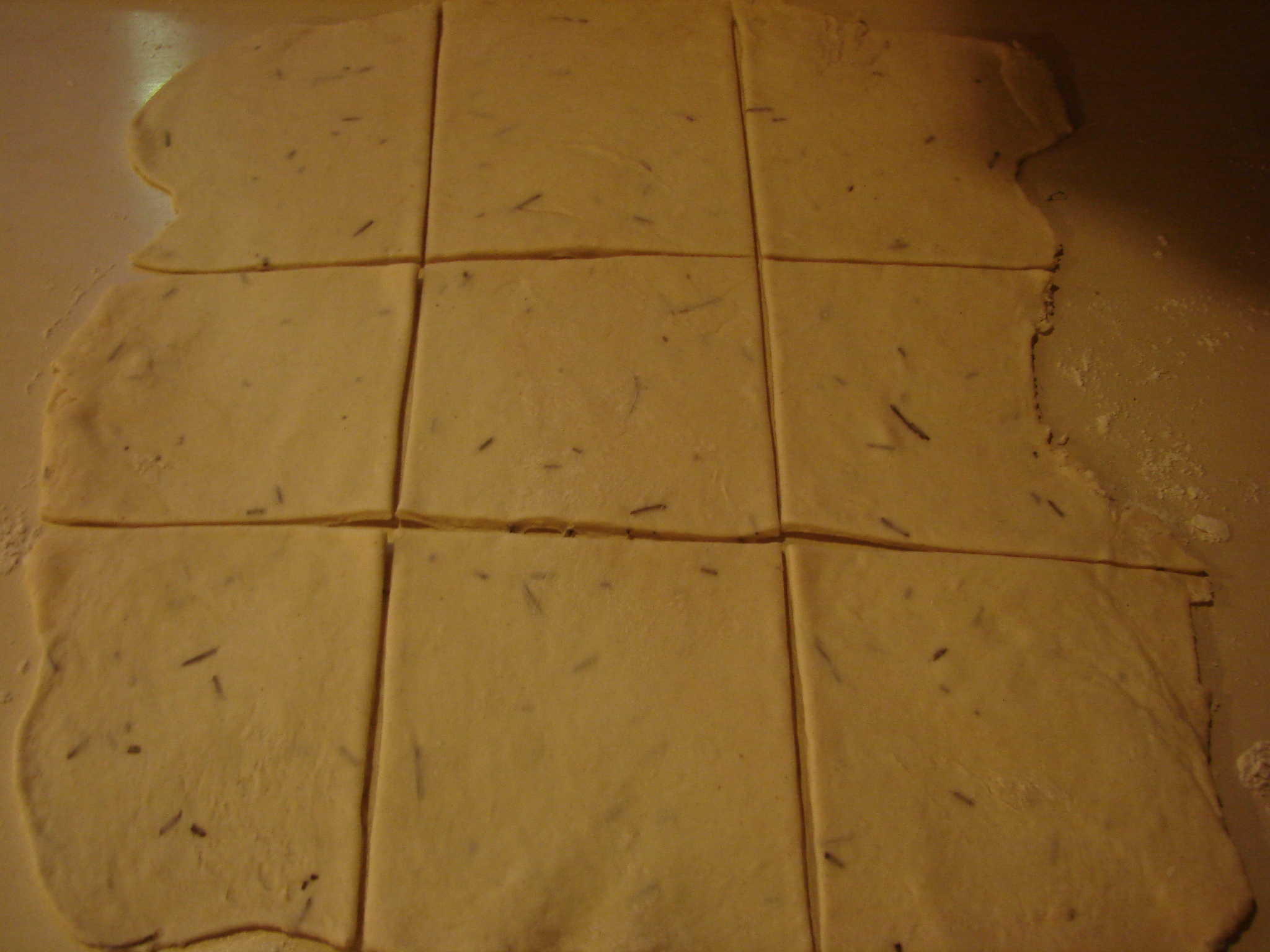3. Roll the pastry out into a long rectanular-ish sheet. Cut it into squares about 4X4 inches.