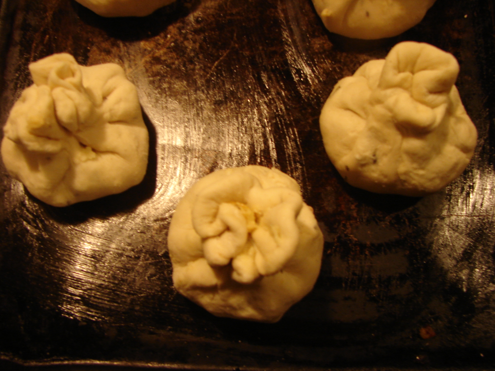 4. Pull the edges up and seal so that you make little bags, seal the “neck” and leave the ends on top a little loose, so they’ll get crispy.