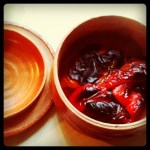Romesco sauce is a combination of roasted red peppers, roasted tomatoes, hazlenuts, almonds, bread, and lots of paprika. In an ideal world, you’d roast the peppers over an open fire, and roast the tomatoes for hours in your oven. In a slightly less ideal world, you’d roast the peppers on the flame of your gas burner. Sigh. I don’t have a gas stove, so I broil my peppers, and they turn out fine. And this time of year, I cheat and use roasted tomatoes from a can. (Hunts fire-roasted diced, as it happens). You could also use peppers from a jar. This sauce will still taste good!