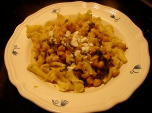 Everyone in my family has started on the winter cycle of sniffles, so I thought it would be nice to have something brothy and spicy – something that clears your head when you breathe in the vapors. We had this over pasta, but it would also be good with couscous or rice, or even with just a crusty loaf of bread. The seasoning is simple but slightly unusual – thyme, allspice, cumin, and as much cayenne as you like. “Raisins and olives?” you cry! In the same dish! Yes! They’re actually delicious together. The raisins impart a mysterious sweetness, and the olives lend their good old olive-y saltiness. Finished with a squeeze of lemon and topped with crumbled goat cheese, this easy, quick workaday dinner has a complex blend of spicy, sweet and tart that goes together perfectly, and makes it quite memorable.