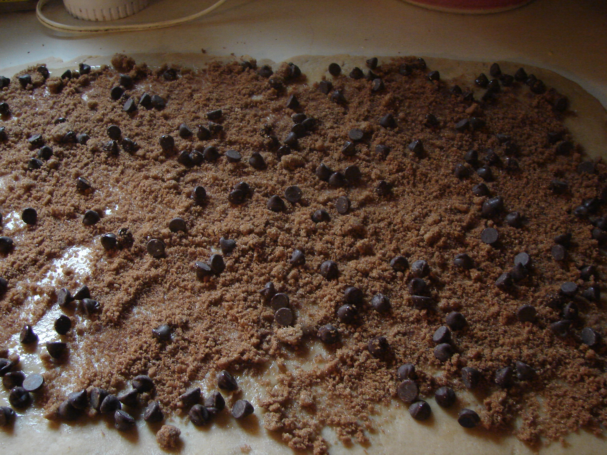 Mix the sugar, cinnamon and chocolate chips together, and then scatter them all over the butter-coated pastry. Try to keep it even and try to reach the edges of the dough.