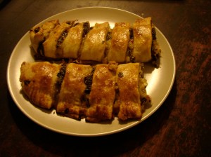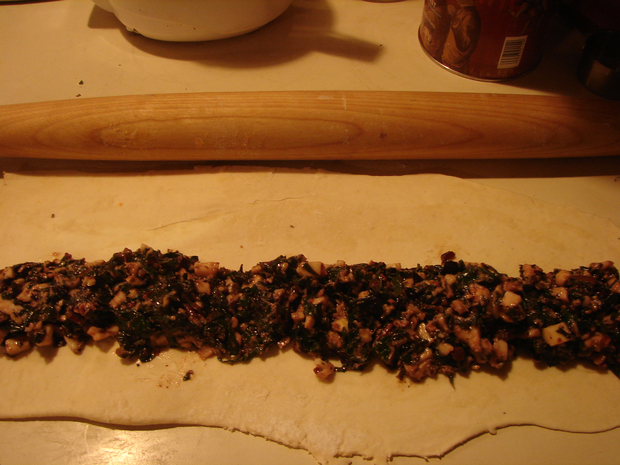 Take your dough out of the fridge and break it into two pieces. Roll each into a rectangle as long as your cookie sheet, and five or six inches across. (It should be about a foot and a half long)
