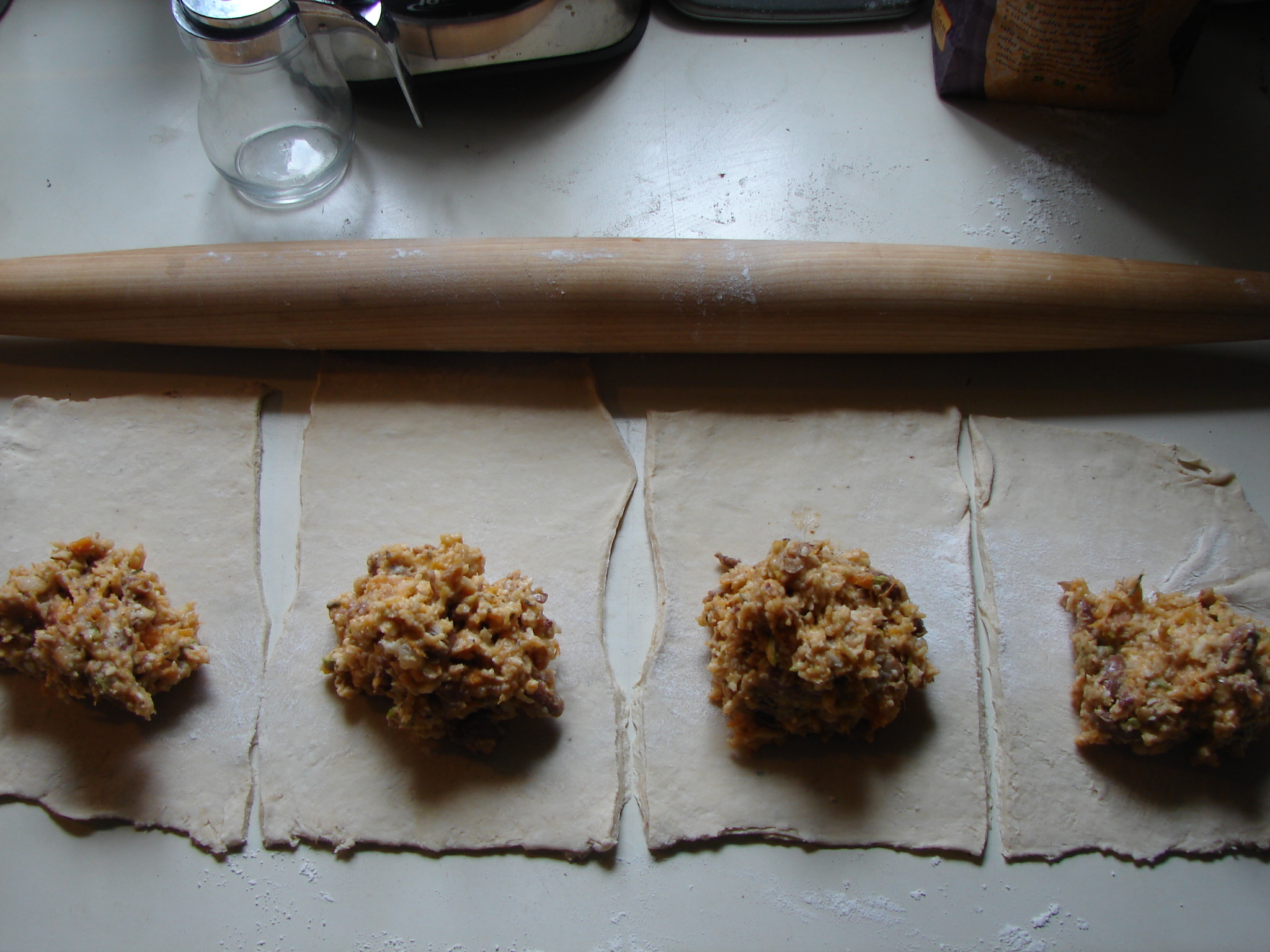 Now…take your dough out of the fridge. Break it into two relatively equal parts. Roll one (on the old lightly floured surface!) into a long thin rectangle. About 6 inches by 16 inches. Slice it into smaller rectangles – 6 inches by 4 inches -ish. I ended up with nine pies. So I sliced one into four and one into five.