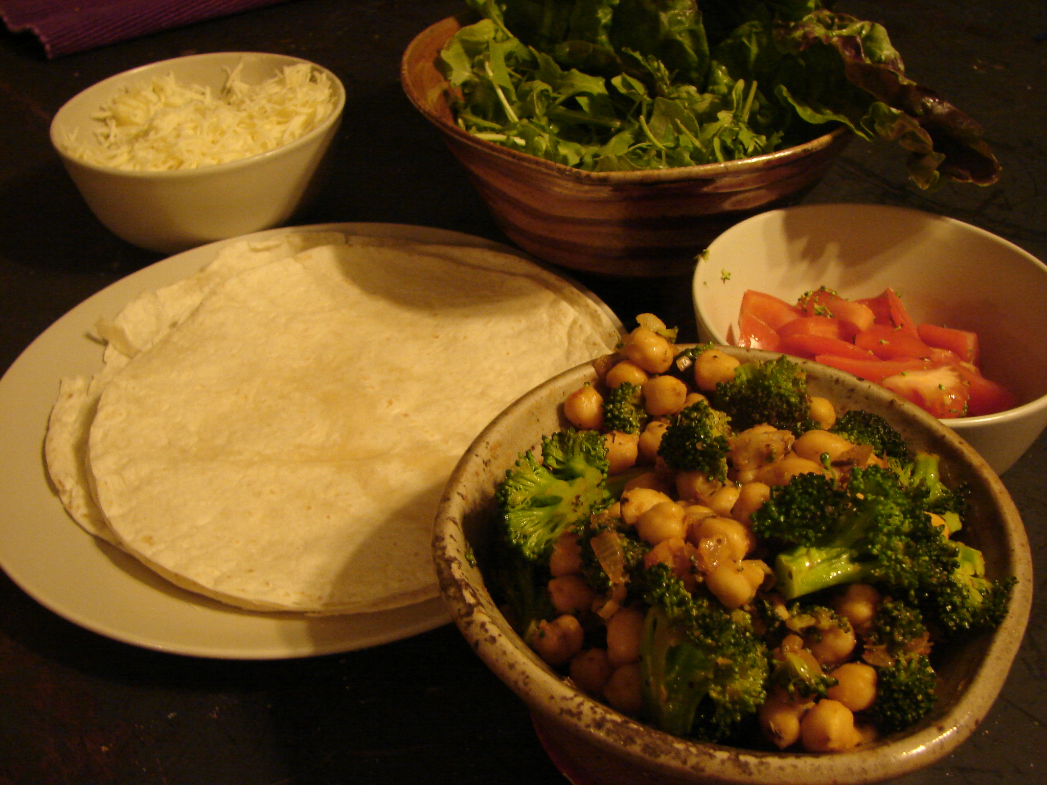 Anyway, last night was a back-to-normal-after-the-holidays meal. Chickpeas and broccoli sauteed with chipotle, sage, oregano and smoked paprika. Smoky, spicy, good. We had them with warm tortillas, lettuce, tomatoes, grated cheese and basmati rice. Ready in minutes and fun to eat.