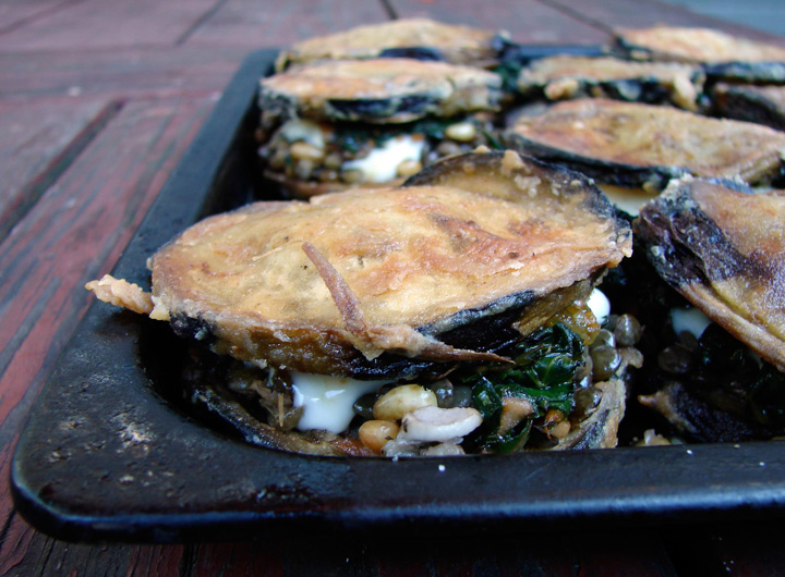 On a clean baking sheet, place a layer of roasted eggplant rounds. Put a heaping tablespoon of french lentils on each one. Put a slice of mozzarella on the french lentils, mound some chard on top of that, and put another round of eggplant on top.