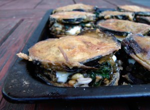 When the eggplants are all lined up in a single layer, pop in the oven and bake for about 40 minutes, till they’re soft and browned. Turn them from time to time so that both sides get brown.