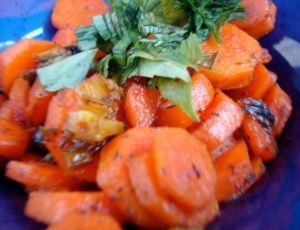 Warm the olive oil in a small frying pan over medium heat. Add the carrots, capers, thyme and sage, and cook until the carrots start to soften, and the bottom of the pan gets brown and caramel-y. Add about 1/3 cup water, and stir well, scraping the bottom of the pan. Add the paprika and turmeric, and cook for about 5 minutes, till the carrots are bright and juicy.