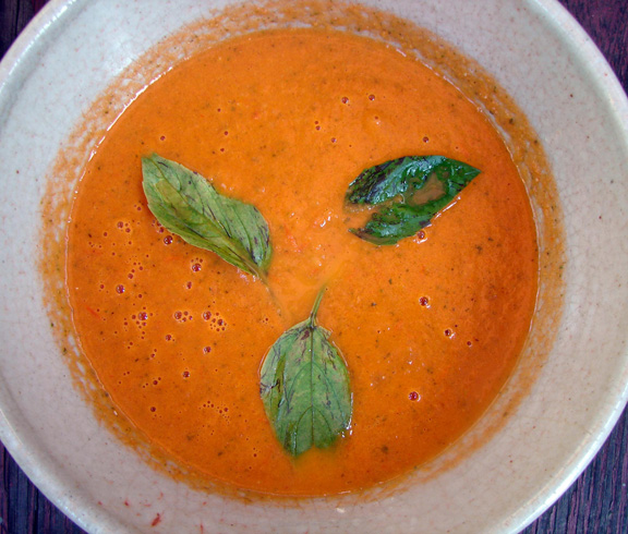 Warm the olive oil in a pot over medium heat. Add the shallots and cook till they start to brown. Add the garlic, and cook a minute or two. Add the pepper, stir to coat and cook till it softens a little, add the tomatoes, spices, and a bit of water. Bring to a low boil, and then reduce the heat and simmer about 10 minutes, breaking the tomatoes up with a wooden spoon. When the peppers seem quite soft, add the butter and balsamic, and puree the sauce until smooth and a bit paler. Season with salt and pepper, and stir in chopped cilantro and basil.
