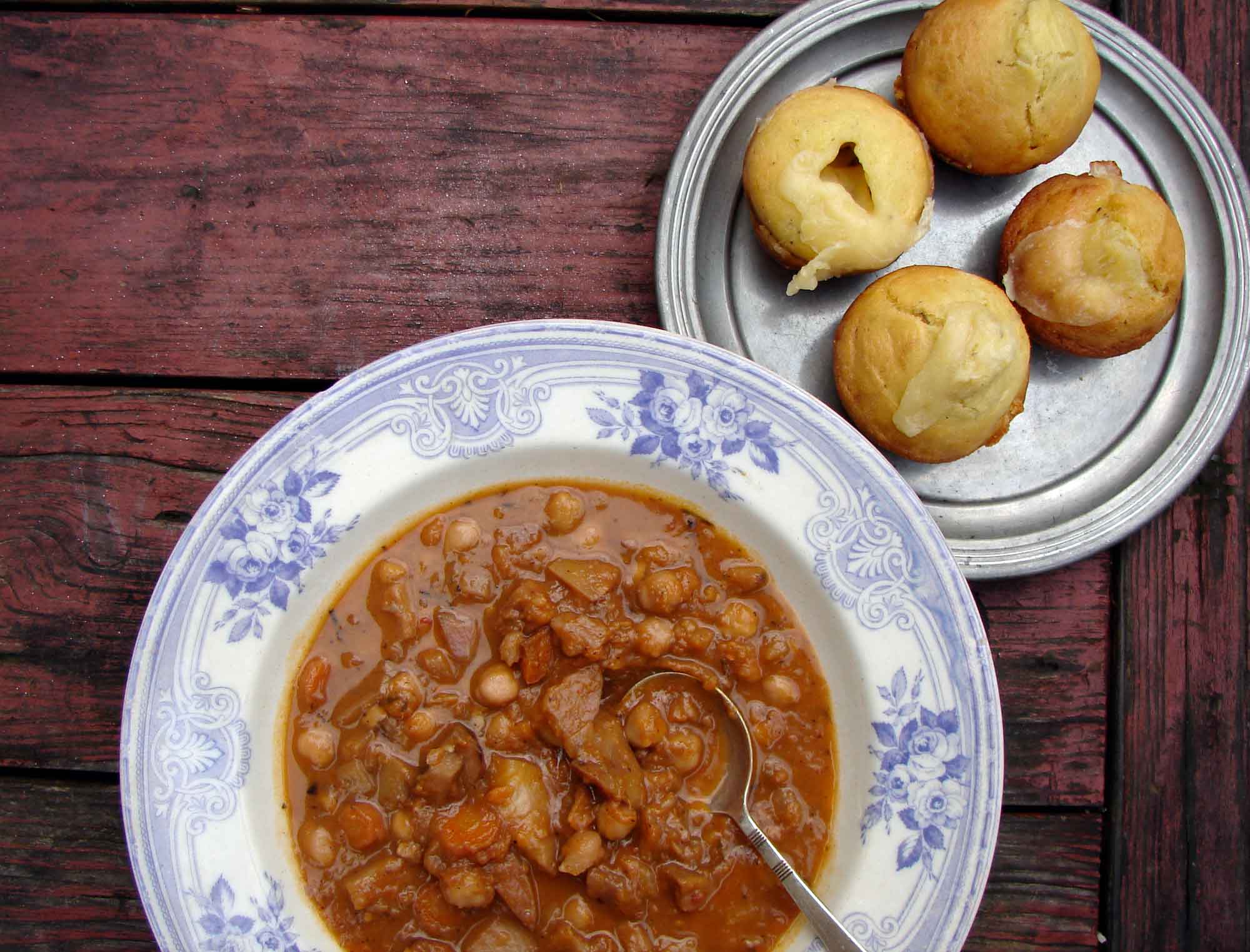 And this is exactly the kind of meal I longed to make during that time that I promise not to talk about any more! Warm, comforting, and very flavorful. We got some root veg from our CSA, and it was the prettiest root veg you’ve ever seen! Golden beets, and peppermint candy-striped beets. By the time I’d roasted and stewed them, they were quite drab, but they made up for it by being delicious. I thought I’d combine all the root veg-y flavors – sharp peppery turnips with sweet carrots and potatoes and earthy beets, with a sauce of red wine and orange juice, lemony sumac and smoky paprika, and autumnal herbs. It turned out very nice. And I made these little semolina muffins, but I tucked mozzarella inside, and when it melted and the muffins baked, it came out of the top like little volcanoes. Fun, and tasty with the stew.