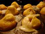 Put a small amount of olive oil in the bottom of each muffin tin, and put the tin in the oven for about five minutes. Remove it, and carefully put a heaping tablespoonful of batter in each hole until it’s all evenly distributed. Carefully poke the cheese into the center of each muffin.