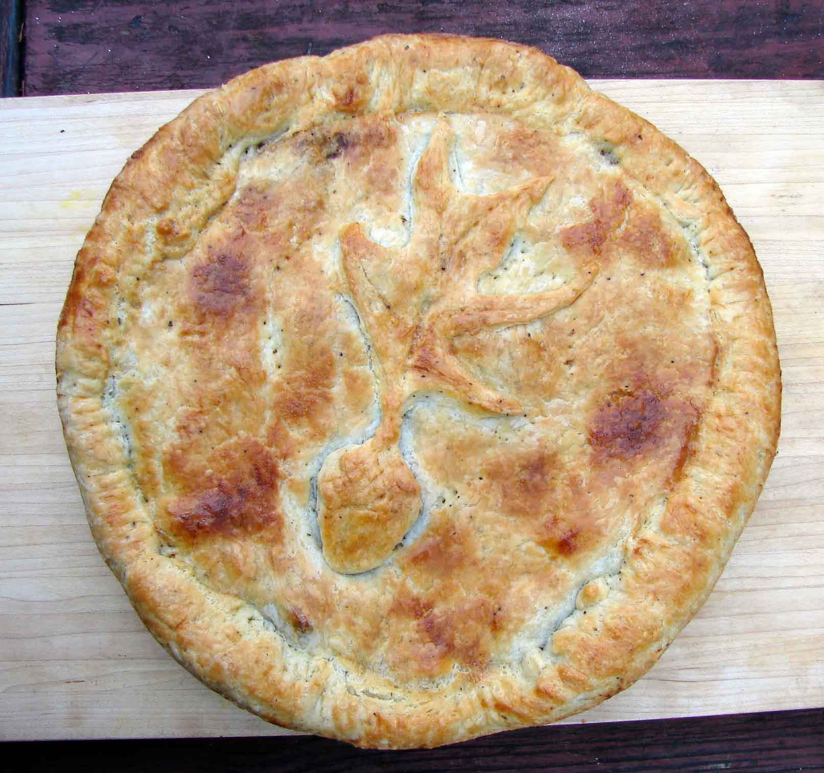 Preheat the oven to 425. Break off 3/4 of the dough and roll it to be about 1/4″ thick. Lightly butter and flour a springform pan or cake pan. Press the dough into the pan and up the sides, leaving a rim of about 1 inch. Spread the filling evenly into the pan. Roll out the remaining quarter of dough to be a circle about 1/4 inch thick and slightly bigger that the pan. Place it on top. Pinch the edges together and roll them down, slightly, then use a fork to press them against the sides of the pan to make a sort of rim. If you like, use some extra dough to make a pretty pattern. Brush the top lightly with egg.