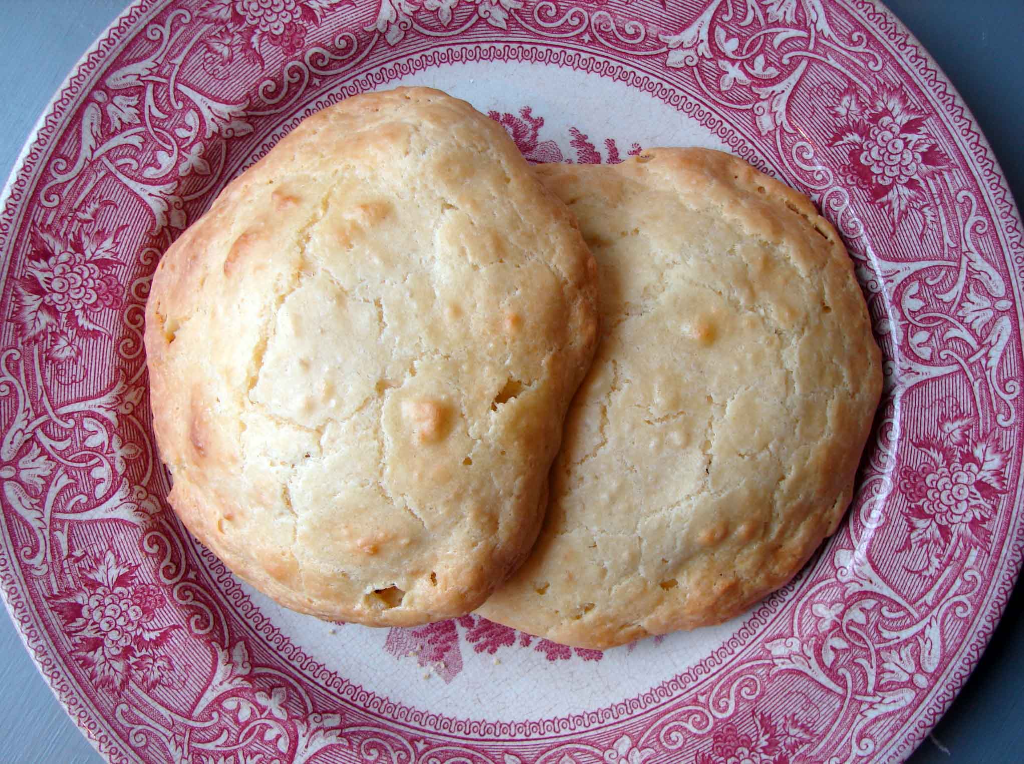 railway-biscuitsI must admit that I mis-translated this recipe, but they turned out delicious anyway. I added about half the flour that I was supposed to. So that when Mrs. Beeton said I should roll out the dough and cut it into squares, I cried, “Mrs. Beeton, you’ve steered me wrong – I can’t roll out something this soft!!” Well, it turns out it was my mistake, but it worked out well. I dropped the batter onto a baking sheet, which is my preferred lazy way to go anyway. The buns were probably a little flatter than they were meant to be, but so so good. Everybody loved them. They’re quite similar to (American) biscuits, so I made them again with baking soda and baking powder instead of yeast, just as an experiment, and they turned out tasty. Softer and richer than your average biscuit, and just the thing fresh out of the oven for yet another chilly January day. And I think they, too, would make nice sandwiches for a journey.