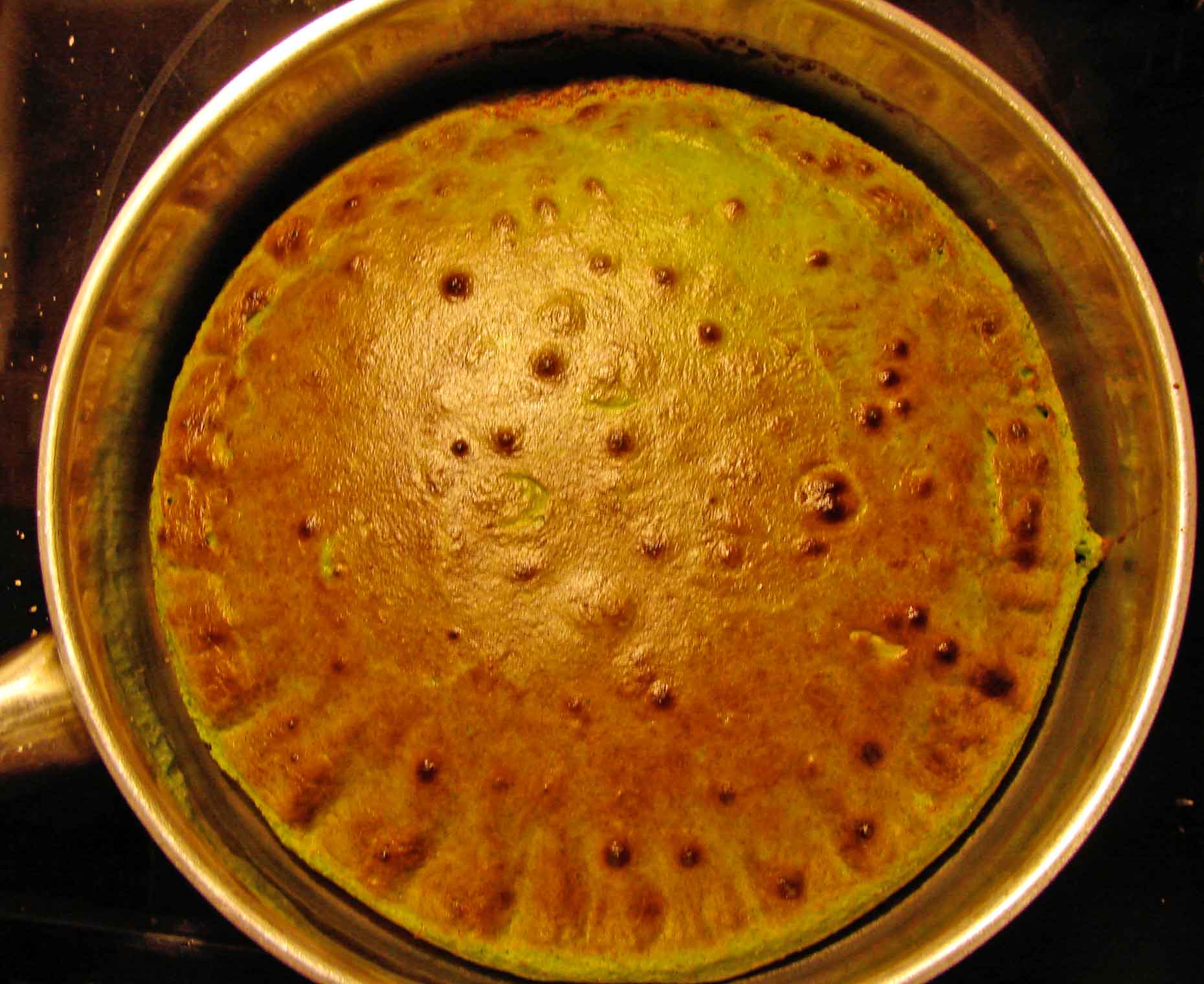Well, I love this quote! I’d been thinking about these things – the mutability of morality, the shifting quality of truth, the unreliability of words. It struck me as so similar to Emerson’s “A foolish consistency is the hobgoblin of little minds, adored by little statesmen and philosophers and divines. With consistency a great soul has simply nothing to do. He may as well concern himself with his shadow on the wall. Speak what you think now in hard words, and to-morrow speak what to-morrow thinks in hard words again, though it contradict every thing you said to-day” (Thank you, universe, for making everything connect.) I’ve said it before and I’ll say it again – I’m a very vague person, I’m blurry at the edges, and I see the world this way. I think it’s dangerous to decide the world is a certain way, and that we have to act in a certain way in the world, according to a strict set of rules. The idea that morality should come from within – that we need a core of strength despite the fact that the outlines are shifting – is so hopeful about humanity, but it’s a little frightening, too. It would be a comfort to believe that there’s some larger system to decide right and wrong – to reward the good and punish the wicked. But how often have these ideals been corrupted by the people that claim to interpret them for us? How dangerous it is to stubbornly hold onto conclusions to the point where we act out of habit, thoughtlessly, without consideration. How much better to constantly question, to actively seek answers, even though they might not exist in any definitive form, or they may shift and change the moment we catch up to them. And to struggle to express ourselves and share our thoughts, even though the words themselves are as transparent and mutable as water. The world is constantly changing, time is streaming by us, we’re never grown-up, we’re never done. It’s a silly notion, but I have a dream-like image of people as spirits, moving through the world, with some sort of light of truth inside of them, burning strong. What nonsense I’m spouting today! What extra-special foolishness! Happy shrove tuesday! A day that we confess our sins and eat pancakes! I like the idea of pancakes as absolution. I know it doesn’t quite work that way, but it’s a nice notion, anyway. I believe the original habit of pancake-eating on shrove Tuesday began as a way to use up all the fat and sugar in the cupboard before then lenten fast began. Or, more likely, it was because it was February, and everybody wanted something simple and comforting. Like this Seussically green, fat, cheesy pancake! We had some saucy chili left over, and I wanted something to eat it with. Something the boys would like, that would contain vegetables and protein, but in a non-objectionable way. And so we have this cake. It has some almonds, for flavor, texture and protein. It’s got flavorful herbs, it’s got a bit of cheese. And it’s BRIGHT GREEN for spring. After all, supposedly “lenten” comes from the old English for long, because the days are getting longer at the moment, and have such a hopeful light about them!