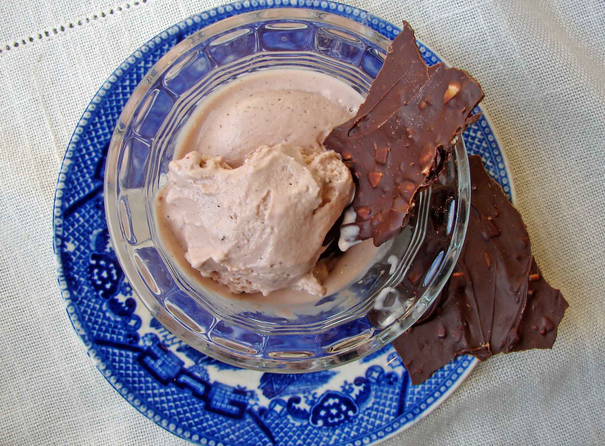 This ice cream was sooooo good! We ate it on valentine’s day, and it was a special dessert just for David and me. I’m not sure the port wine cooked off, because I felt pleasantly giddy after a few bowls! Basically, this is a port wine zabiglione (I love that word!) with some spiciness from cinnamon and black pepper, and some fruitiness from a few spoonfuls of good cherry jam. It’s mixed with lightly whipped cream, and frozen in an ice cream maker of any make or variety. And I served it with “bark” made of bittersweet chocolate, almonds, dried tart cherries, cayenne and cinnamon – crunchy, soft and kicky, all at once, nicely in concert and contrast with the flavor and texture of the ice cream. You could easily add anything you like to the bark (nuts, bolts, needles and pins…) any kind of dried fruit, any kind of nut, candied ginger, lemon peel, nutmeg, cardamom, coconut, whatever suits your fancy!