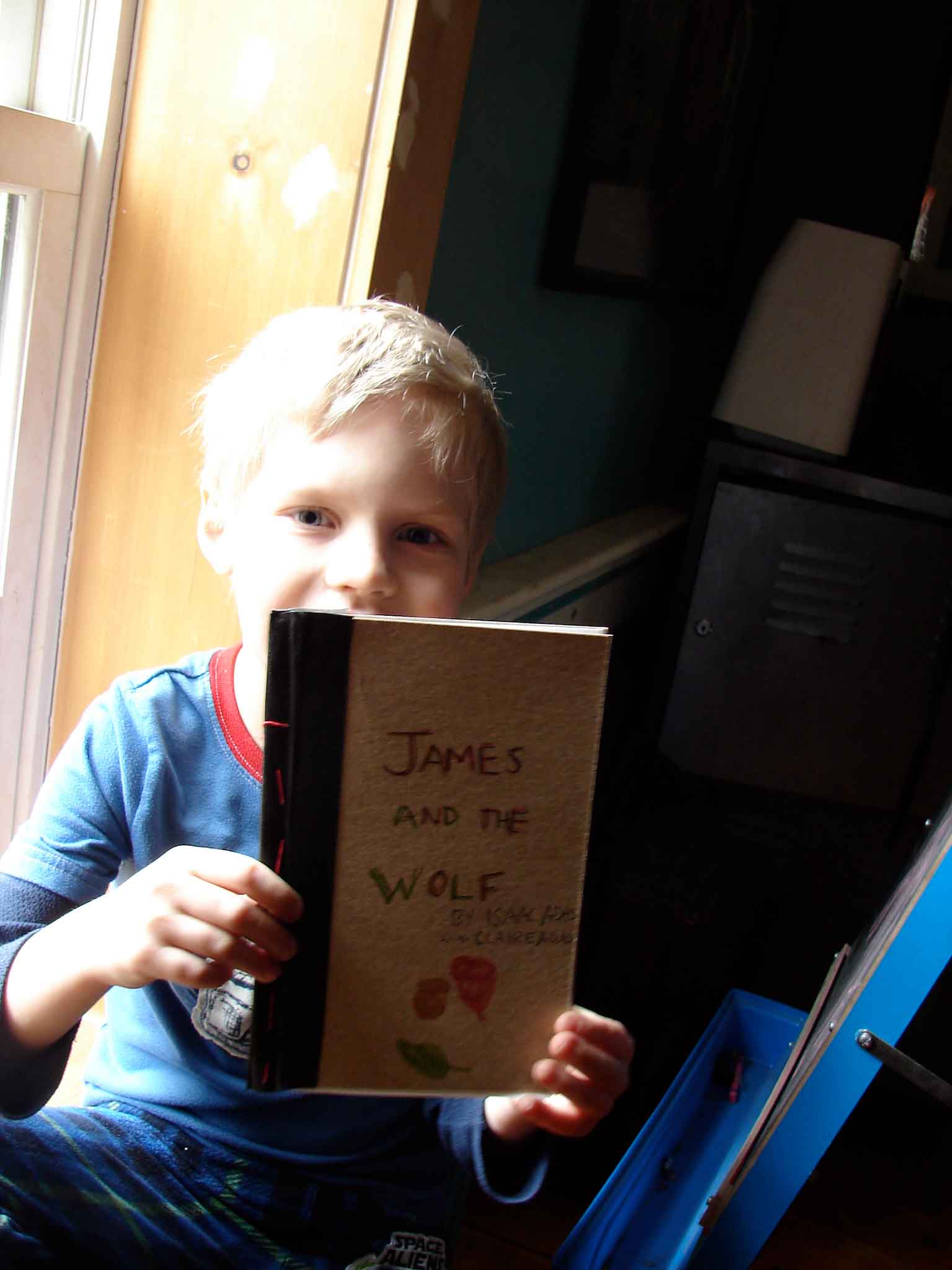Isaac and I made a book. We gave it a cardboard and gaffer tape binding, and I broke a needle in two places trying to sew the pages through the tape. Isaac dictated, I wrote the words, and Isaac illustrated. It tells the story of a boy named James. He lives in the forest with a pack of vegetarian wolves who like to snuggle with him. (“Really?” David said, upon reading this part, “Isaac came up with that? Because it sounds suspiciously Claire-y to me.” It’s all Isaac, I swear! Of course, I made Isaac….) Let’s see, where were we? Ah yes, one day, Black Fur the wolf goes across the river to pick raspberries. A pack of non-vegetarian wolves surrounds him and tells him he should eat his friend James, because human boys are delicious. Suddenly, James and his wolves come up to the raspberry patch! (In a stunning twist nobody could have predicted, James is riding on a giant squirrel-dog named Scog.) James goes rushing at the leader of the other wolves, who is understandably afraid, but rather than hurt him, he feeds him a cake made of nuts, raspberries and leaves. Why, it’s delicious! All the wolves become vegetarian and they spend their days helping each other find food and making meals together. And that’s how it goes. The End.