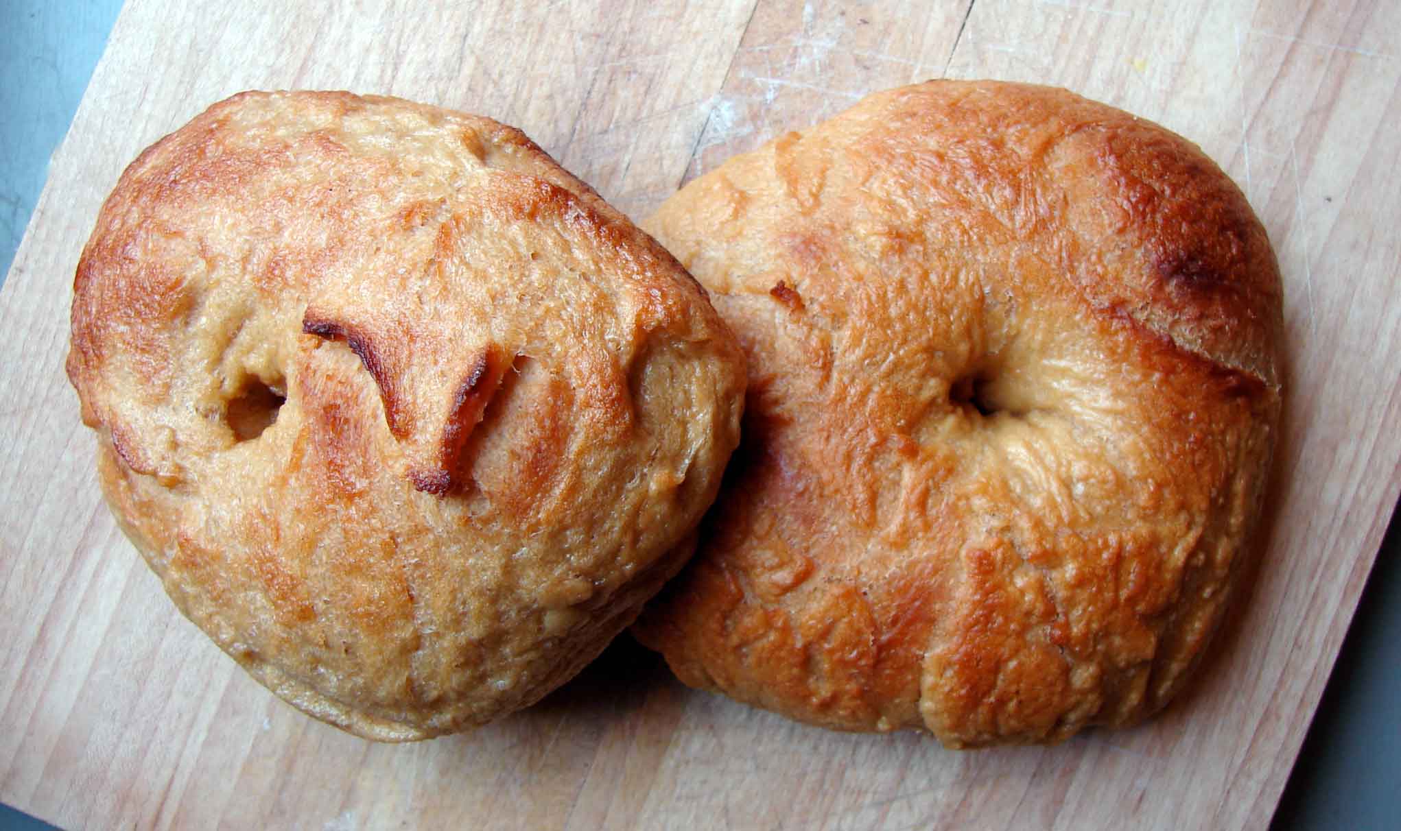 Drop as many bagels as will comfortably fit into the water bath. (I could fit four) They should rise right to the top. Cook twenty seconds, and gently turn over to cook for another twenty seconds. Remove with a slotted spoon, drain in a colander and then set on the ungreased baking sheet, leaving a bit of space because they’ll puff up slightly.