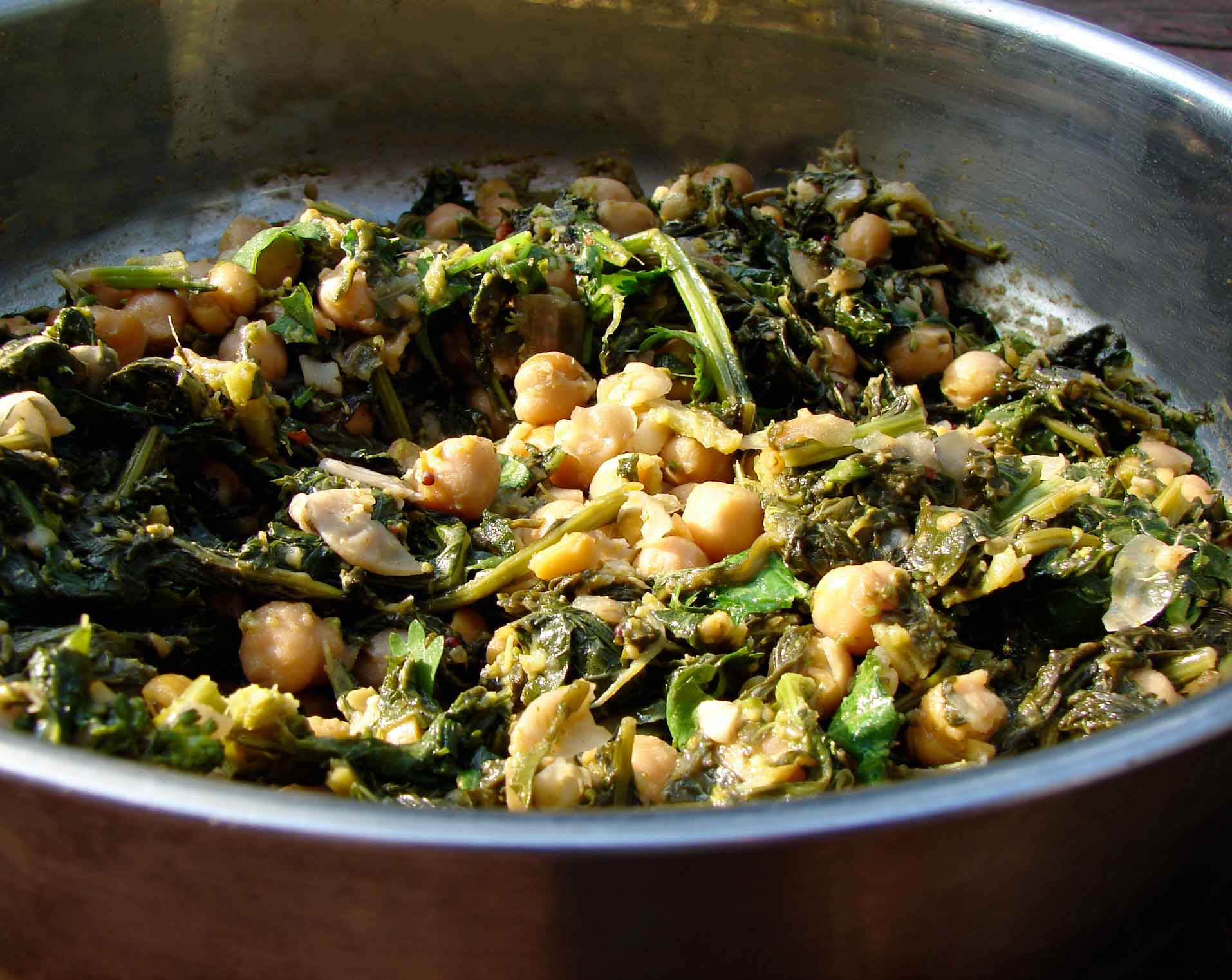 I love broccoli rabe, with its tenderness, and its bitterness, and its strong pleasant flavor. I’m the only one in my family that craves it. David will enjoy it from time to time, and the boys won’t go near it, so I feel like it’s the most indulgent thing that I cook. I make it because I want to eat it. This particular preparation was a sort of compromise. The boys do like curried chickpeas, so I served this with basmati rice, and picked out the chickpeas for them, and saved all the tender greens for myself!!
